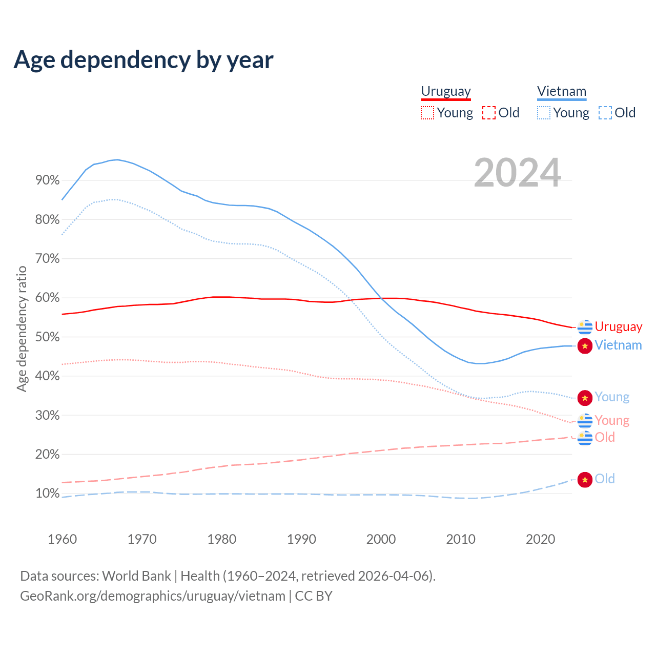 - Uruguay is ranked 63/196 by median age (oldest to youngest) vs 84/196 for Vietnam.