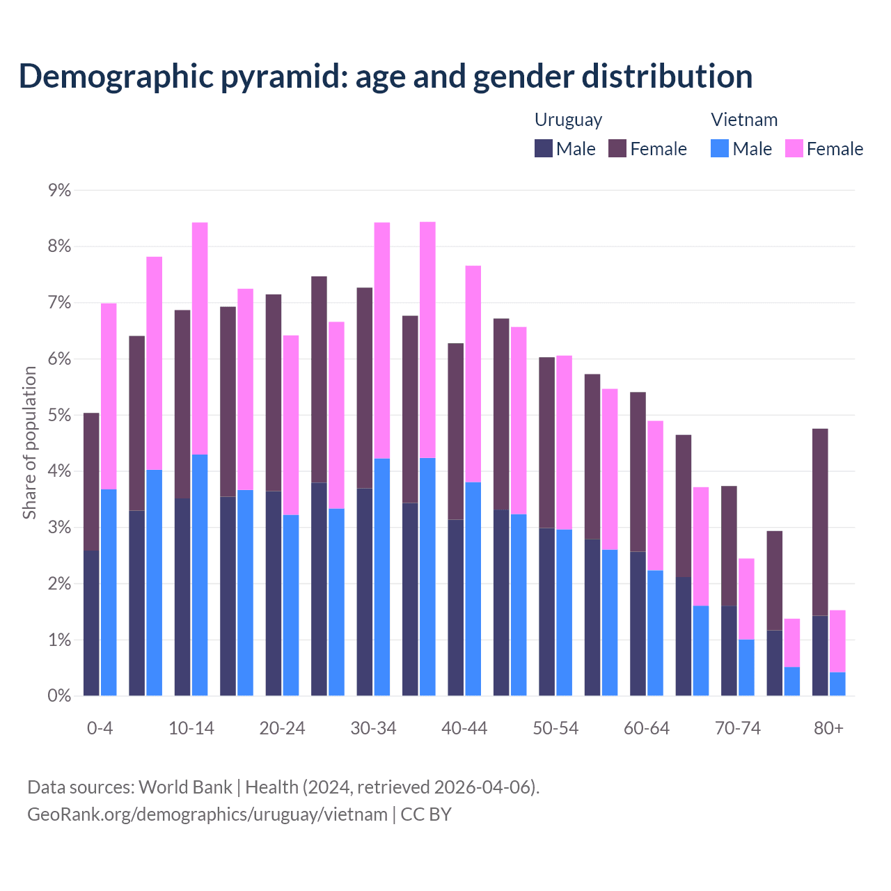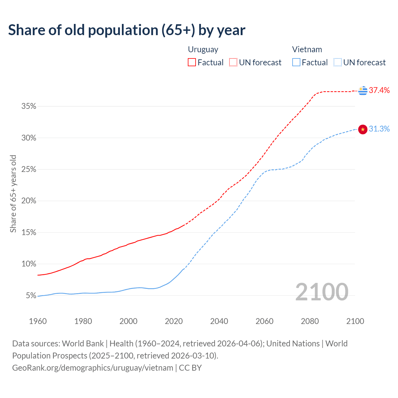 The share of older people aged 65 and over is 16% in Uruguay and 9.05% in Vietnam. Life expectancy in Uruguay compared to Vietnam .