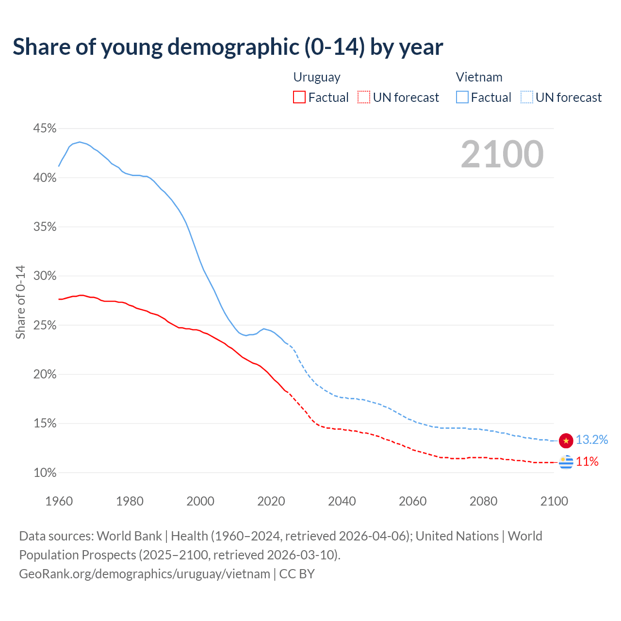 - The share of young demographic (0-15 years old) in Uruguay is 18.3% vs 23.2% in Vietnam.