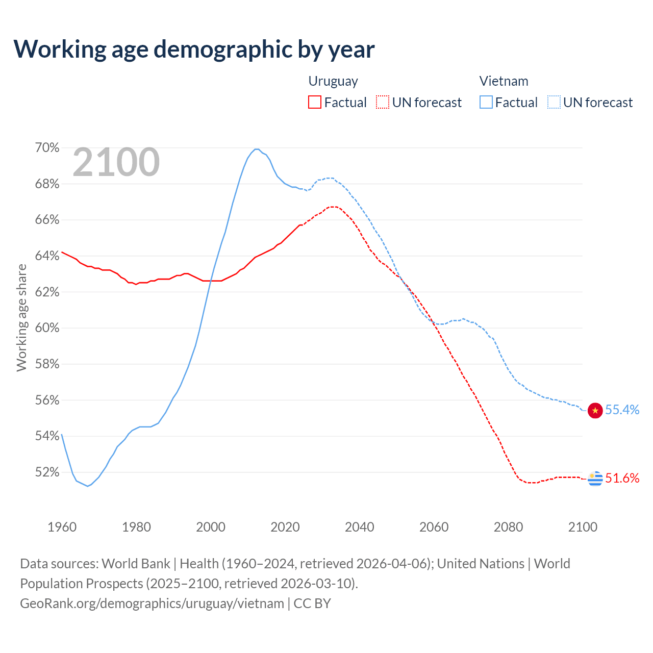 - Uruguay has 2.22M working age adults (aged 15-64) vs 69.3M in Vietnam.