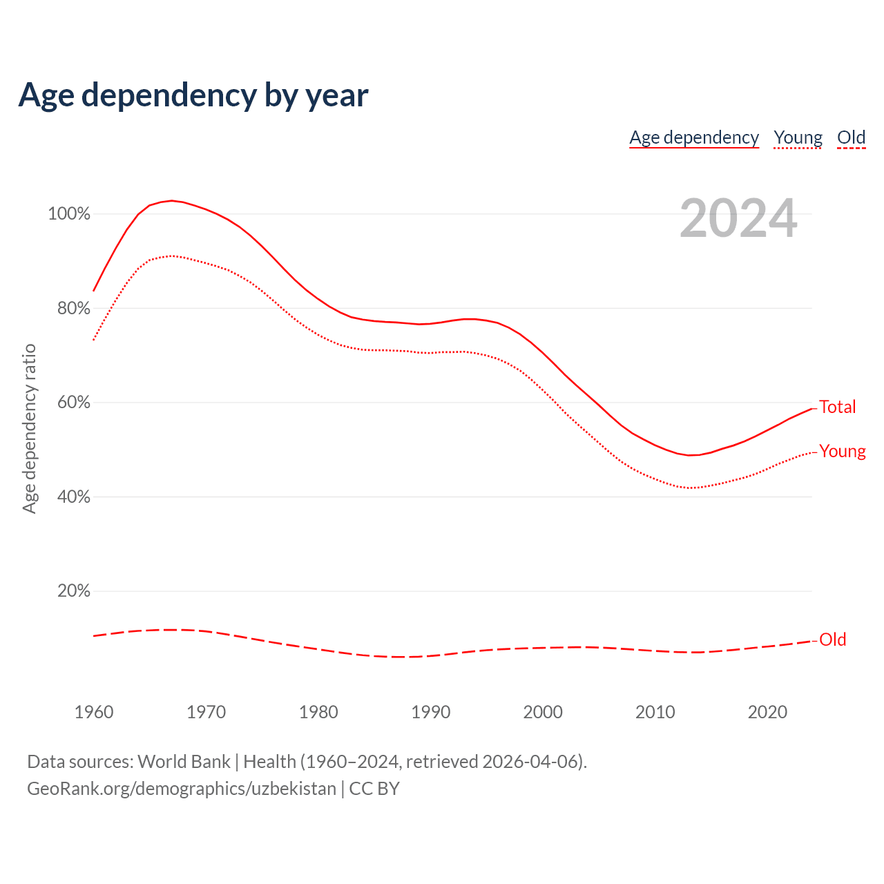 Data sources: World Bank | Health (1960–2024, retrieved 2026-04-06); U.S. Census Bureau (1960–2024, retrieved 2026-02-08).