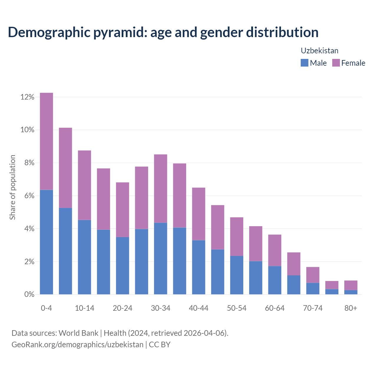 With a population of 36.4M people, Uzbekistan has a median age of 27.9 years which makes it the 116/196 oldest country. 31.1% of the demographic are children 0-14 years old, 63% are working-age people aged 15-64, and 5.86% are older population aged 65+ years.