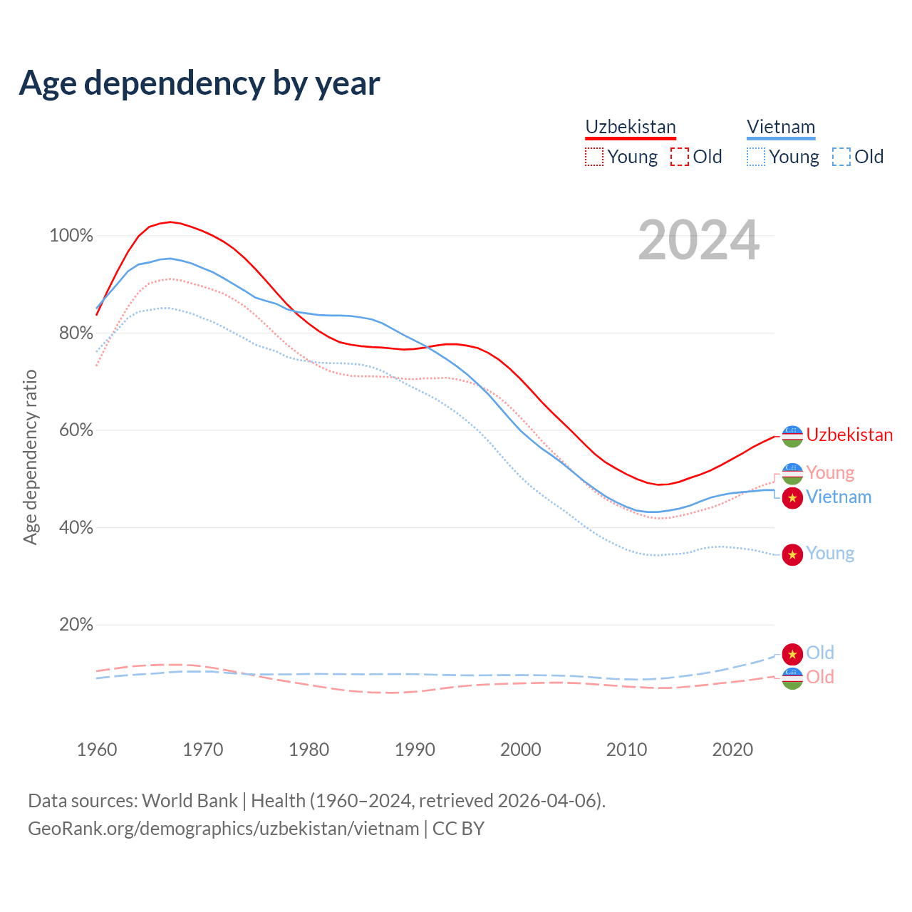 Data sources: World Bank | Health (1960–2024, retrieved 2026-04-06); U.S. Census Bureau (1960–2024, retrieved 2026-02-08).