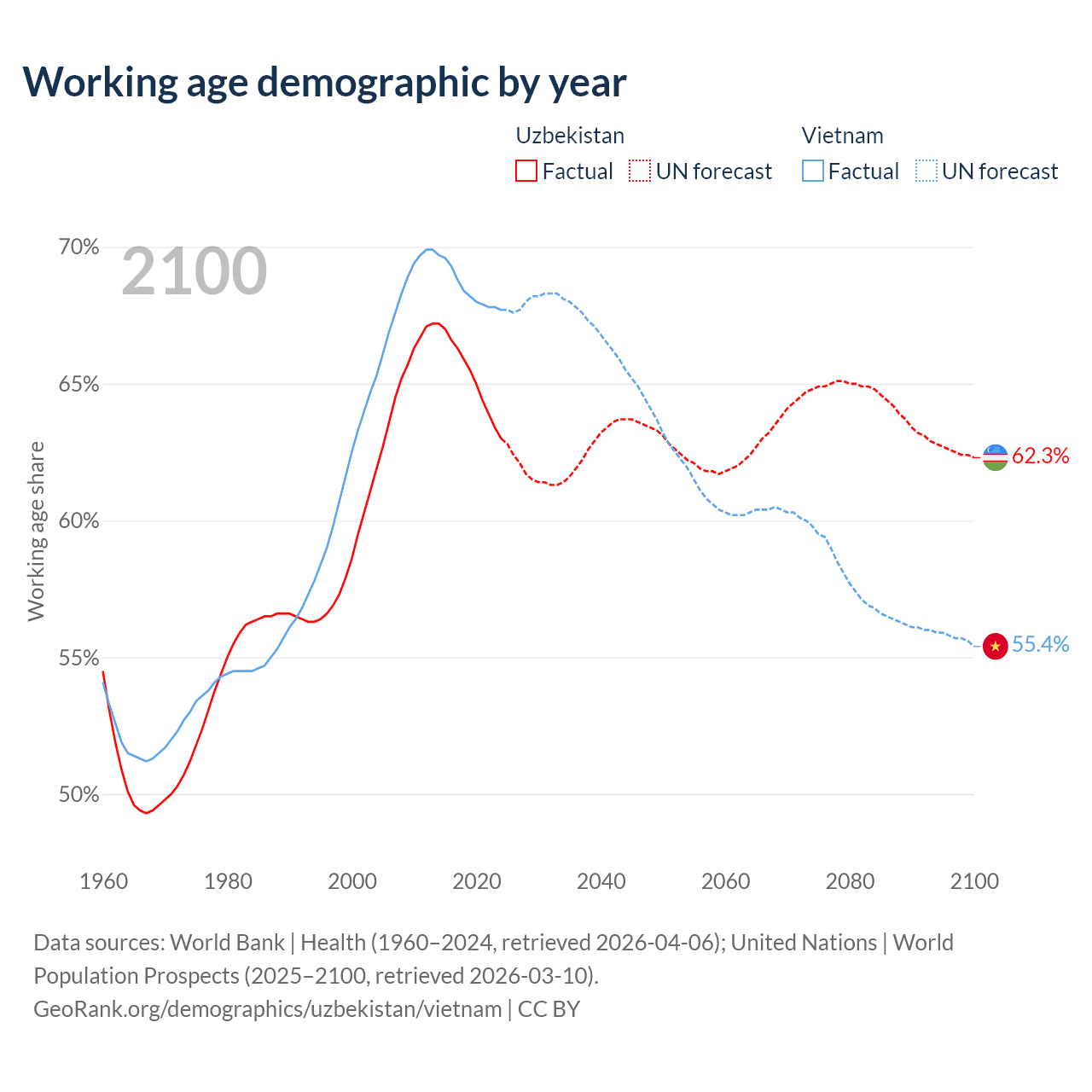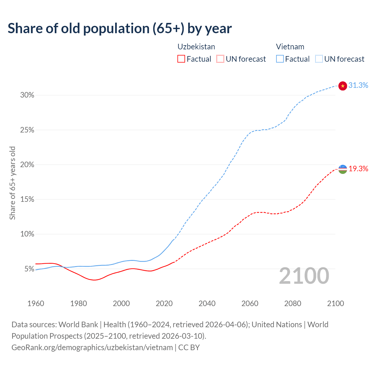 The share of older people aged 65 and over is 5.86% in Uzbekistan and 9.05% in Vietnam. Life expectancy in Uzbekistan compared to Vietnam .