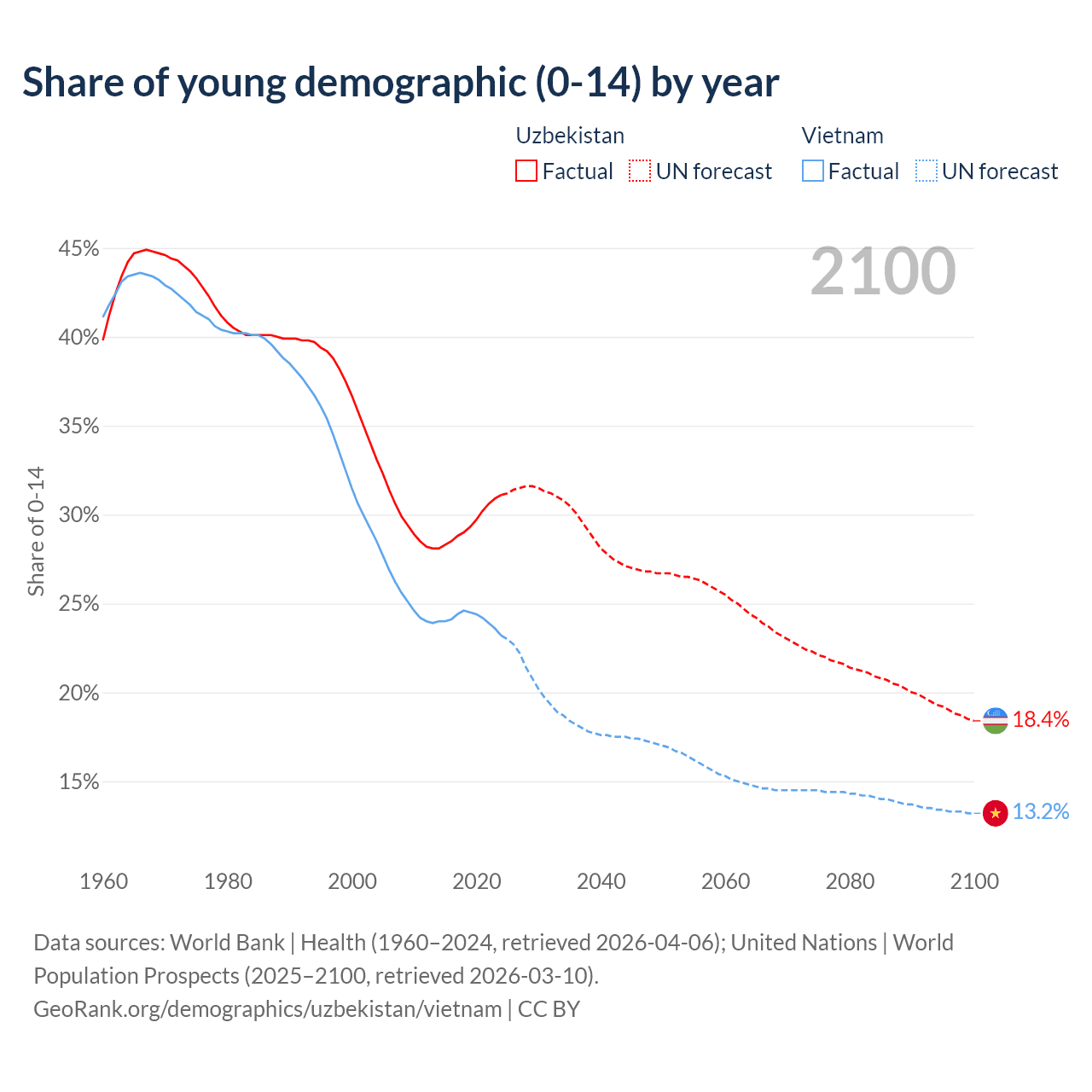 Median age Uzbekistan vs Vietnam, 1960-2100
