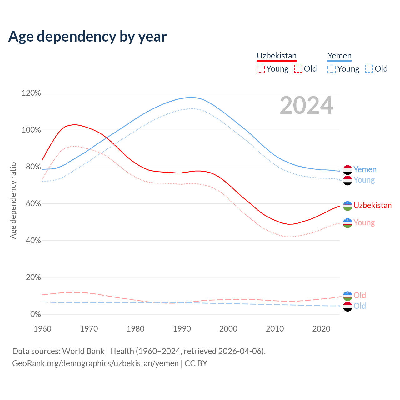 - The share of old-age demographic (65+) in Uzbekistan is 5.86% vs 2.52% in Yemen.