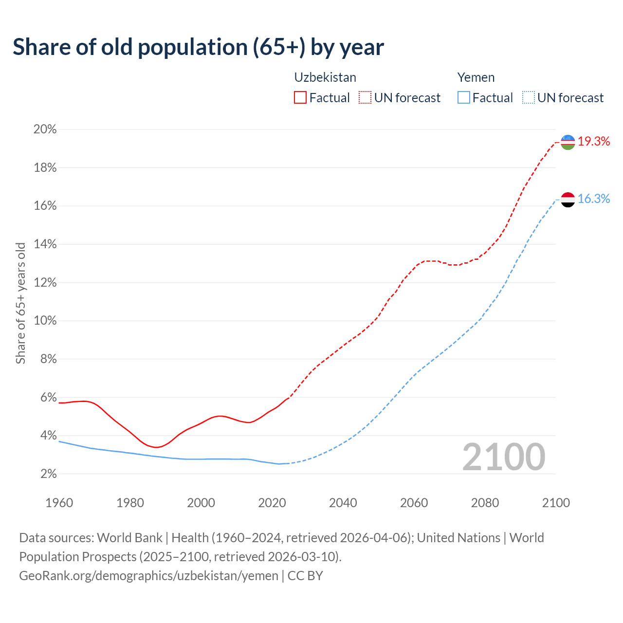 The share of older people aged 65 and over is 5.86% in Uzbekistan and 2.52% in Yemen. Life expectancy in Uzbekistan compared to Yemen .