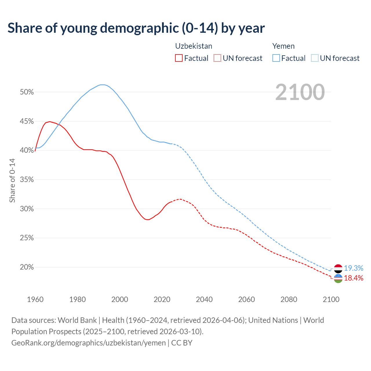 - The share of young demographic (0-15 years old) in Uzbekistan is 31.1% vs 41.1% in Yemen.