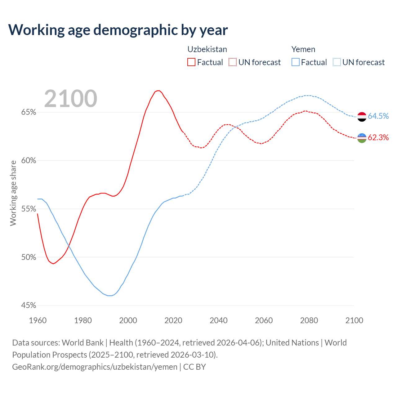 - Uzbekistan has 23.9M working age adults (aged 15-64) vs 24.4M in Yemen.