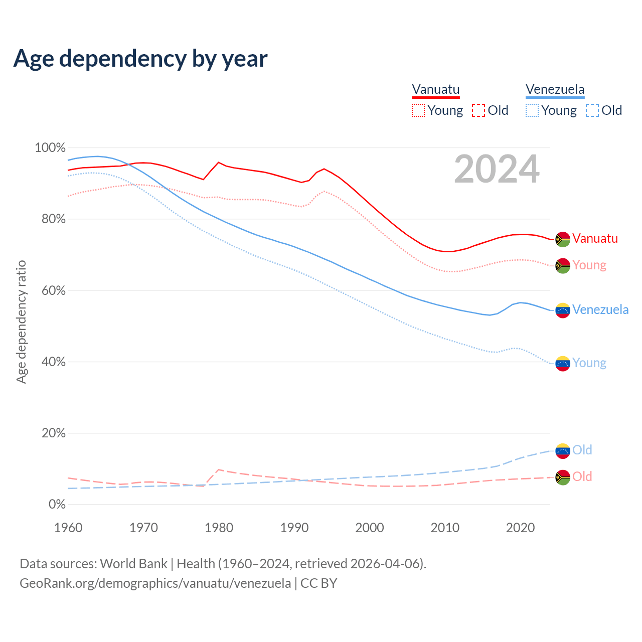 - Vanuatu is ranked 156/196 by median age (oldest to youngest) vs 104/196 for Venezuela.