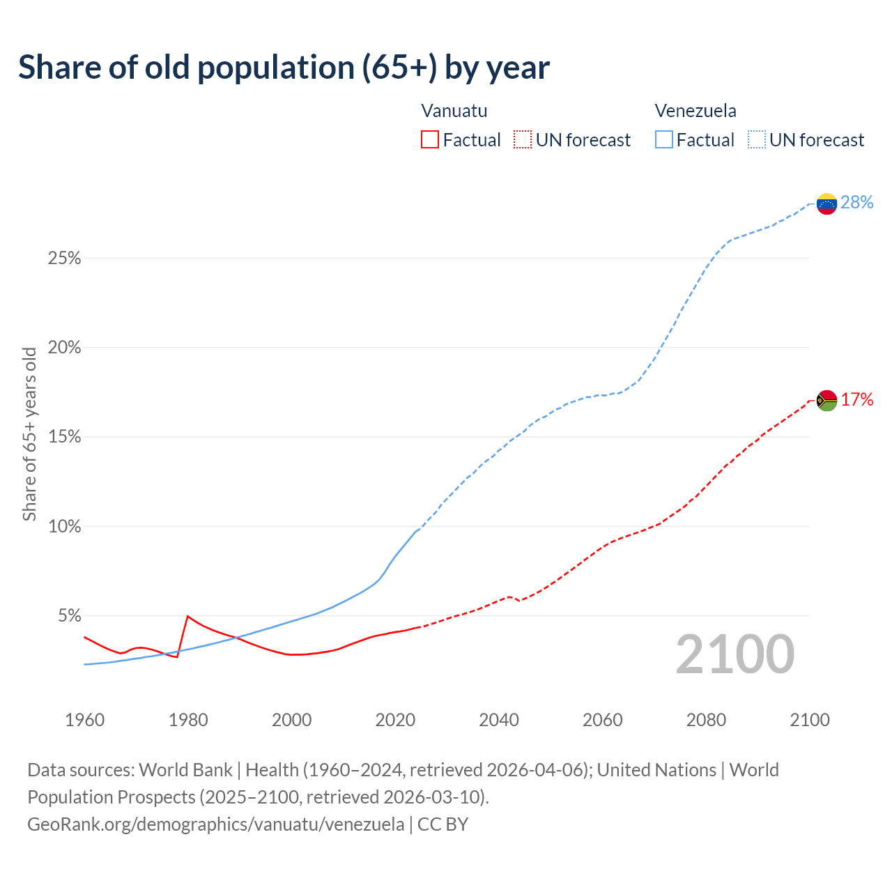 The share of older people aged 65 and over is 4.3% in Vanuatu and 9.68% in Venezuela. Life expectancy in Vanuatu compared to Venezuela .