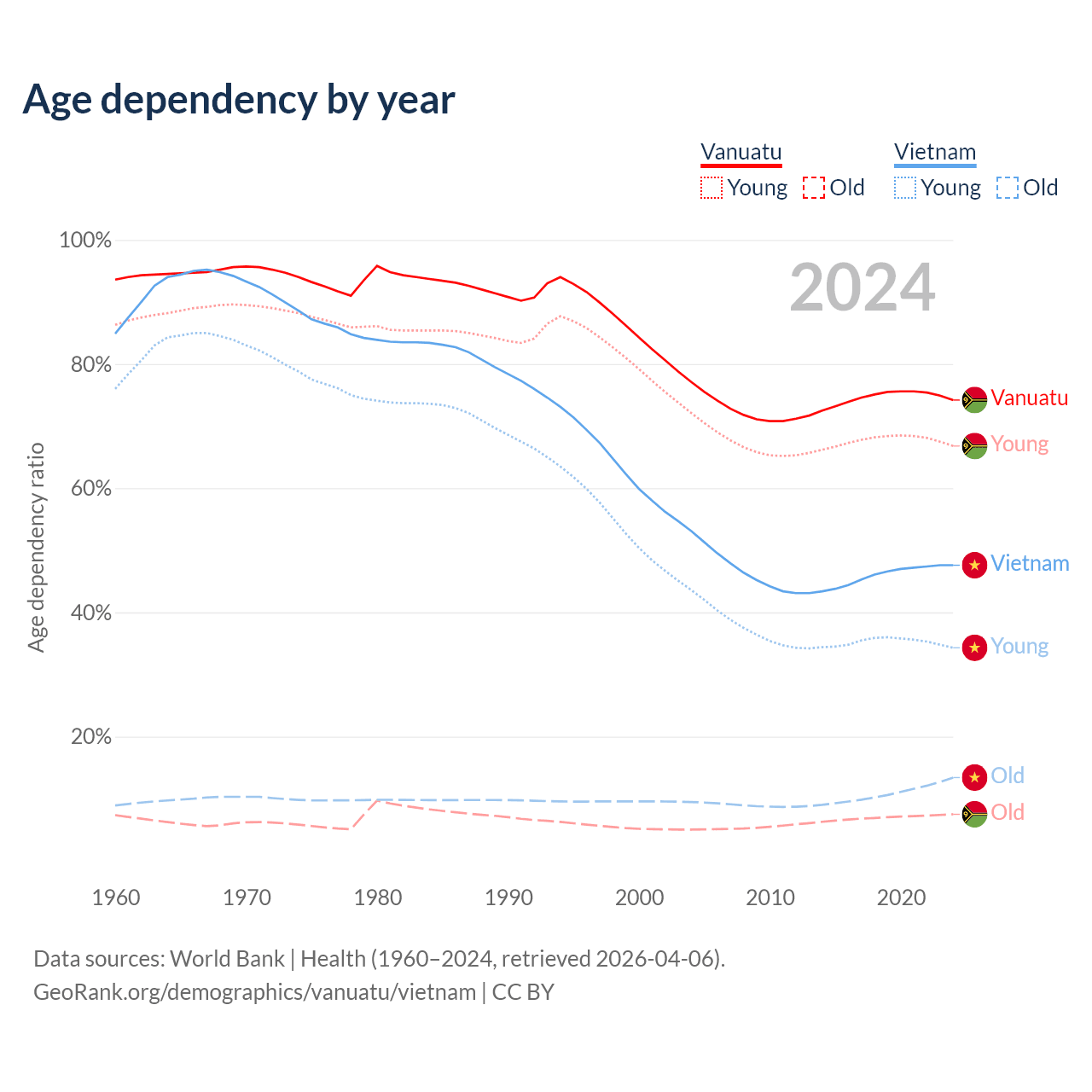 - Vanuatu is ranked 156/196 by median age (oldest to youngest) vs 84/196 for Vietnam.