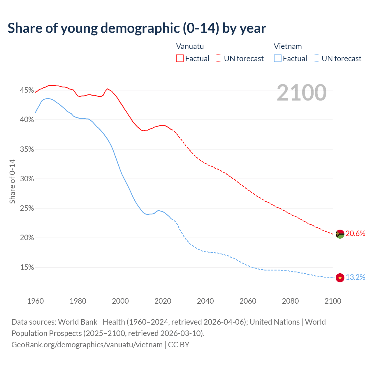 - The share of young demographic (0-15 years old) in Vanuatu is 38.3% vs 23.2% in Vietnam.