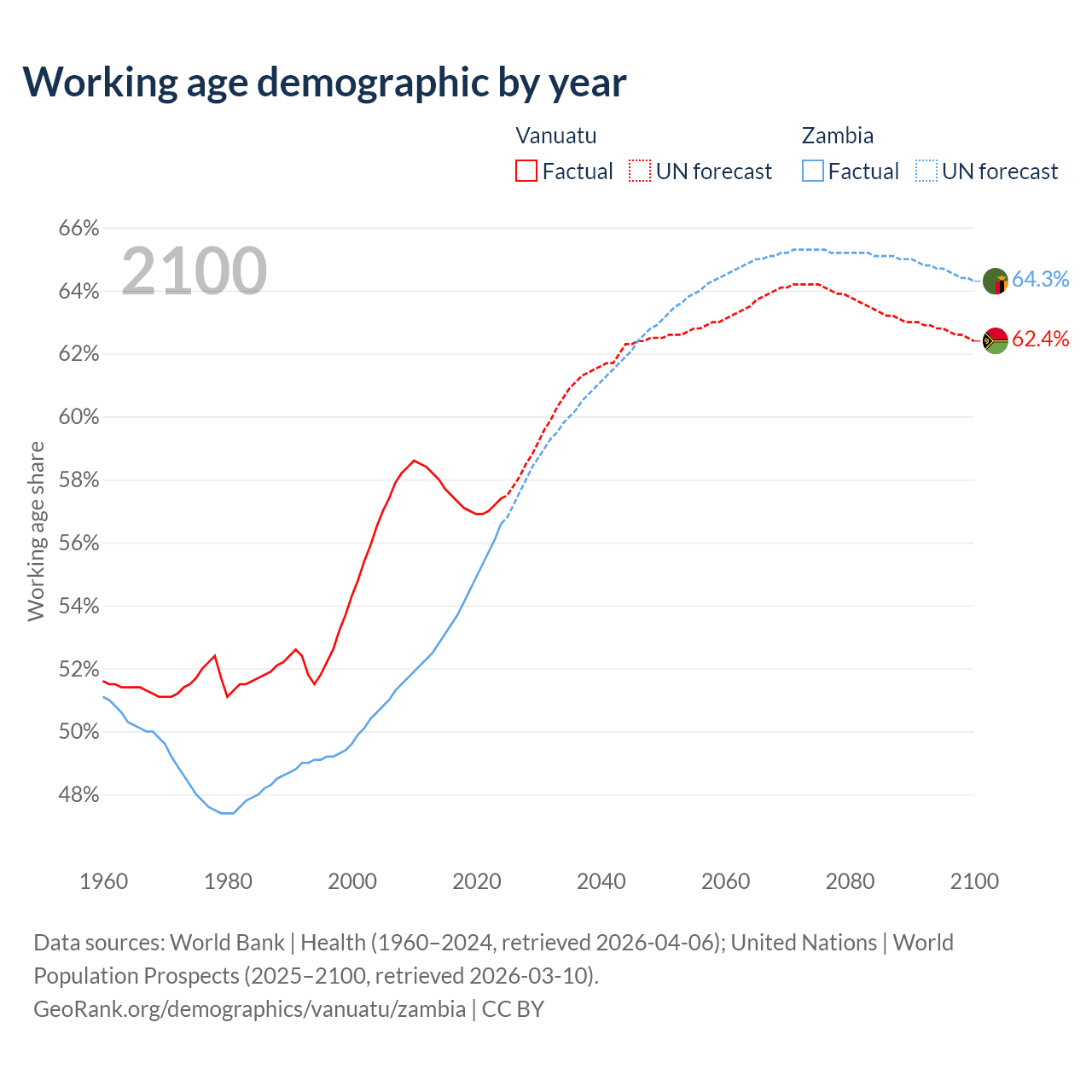 Median age Vanuatu vs Zambia, 1960-2100