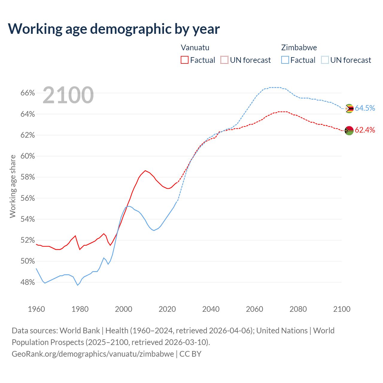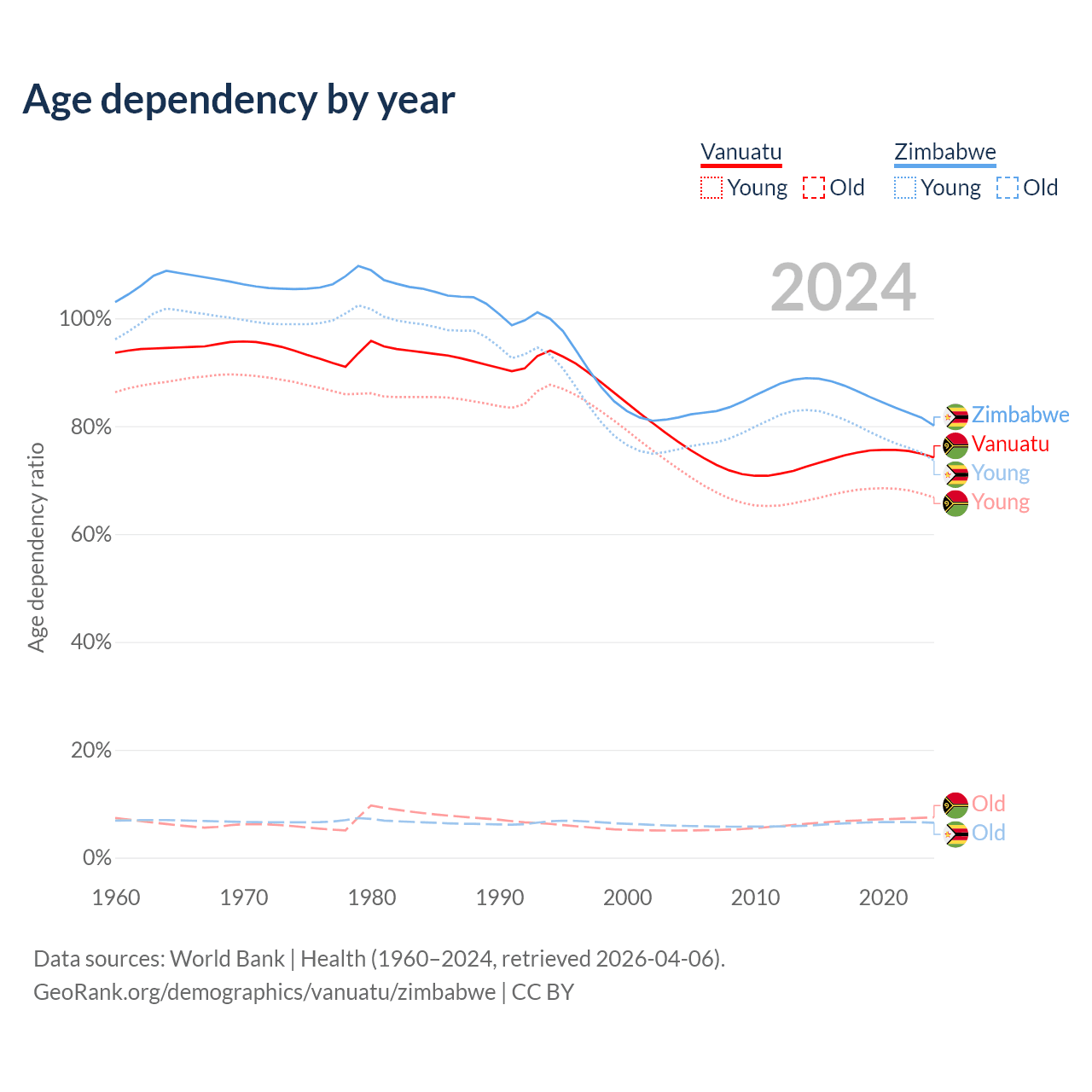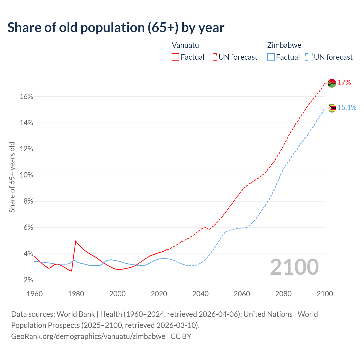 The share of older people aged 65 and over is 4.3% in Vanuatu and 3.6% in Zimbabwe. Life expectancy in Vanuatu compared to Zimbabwe .