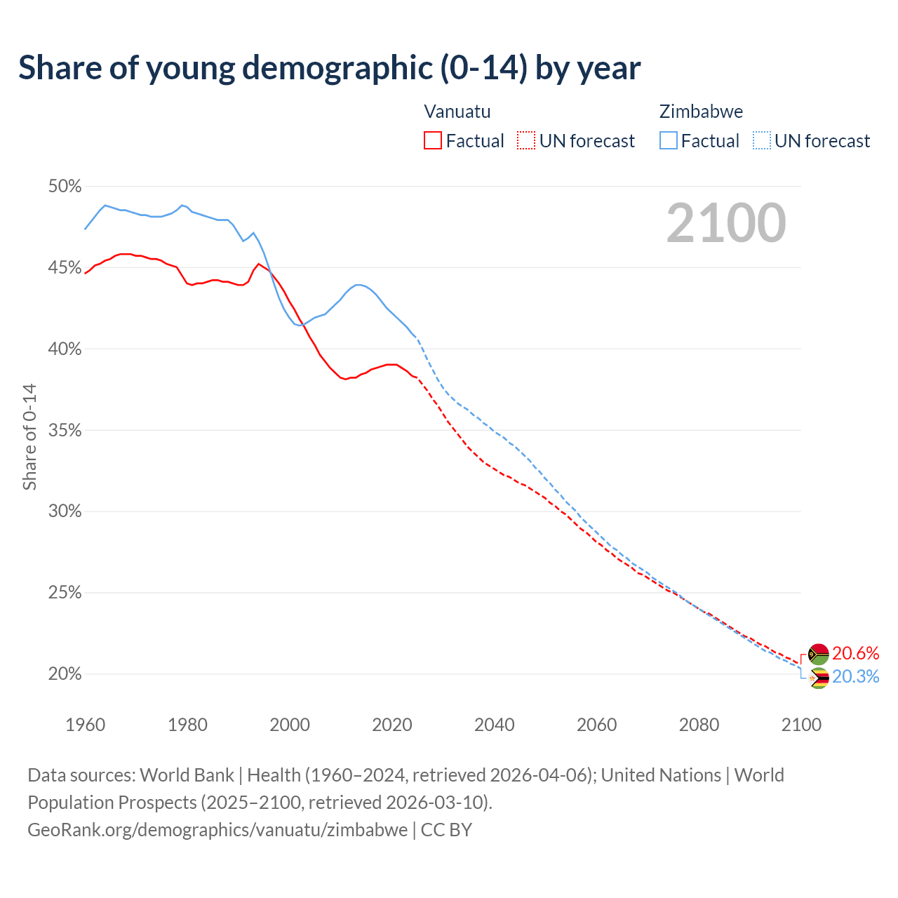 - The share of young demographic (0-15 years old) in Vanuatu is 38.3% vs 40.9% in Zimbabwe.