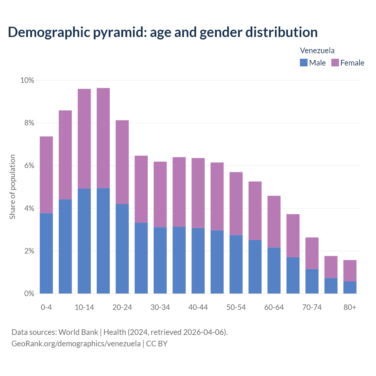 The share of children aged 0-14 in Venezuela decreased from 32.2% to 25.5% between 2004 and 2024 due to changes in birth rates.