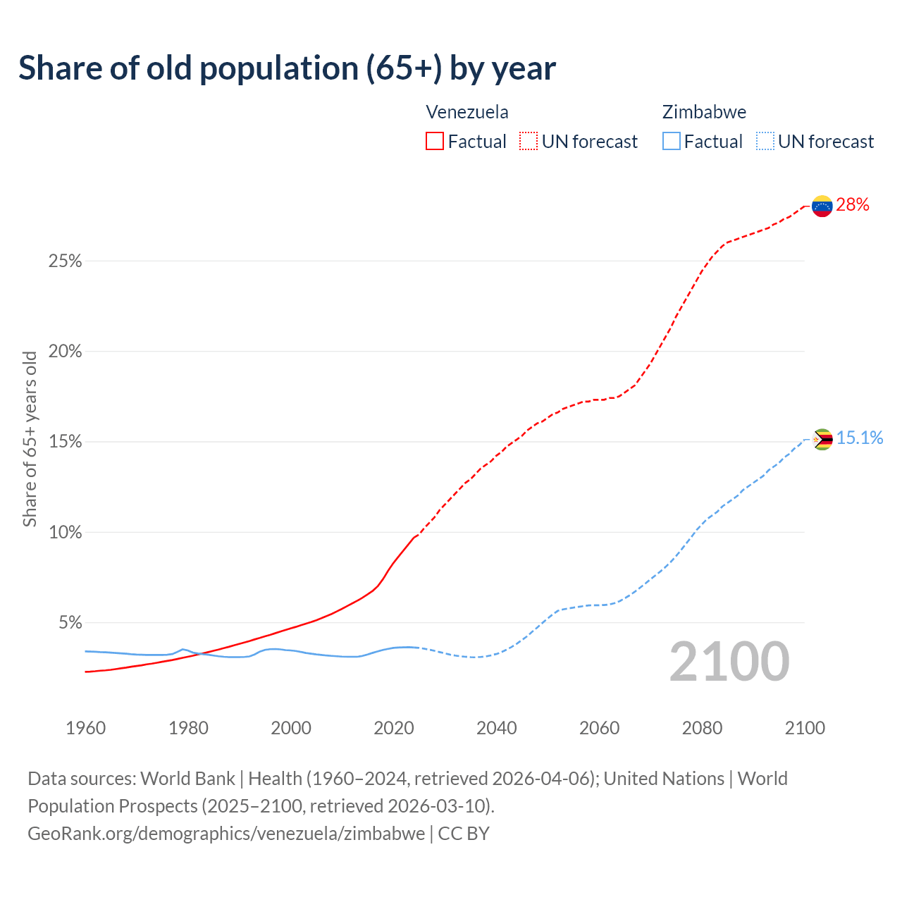 The share of older people aged 65 and over is 9.68% in Venezuela and 3.6% in Zimbabwe. Life expectancy in Venezuela compared to Zimbabwe .