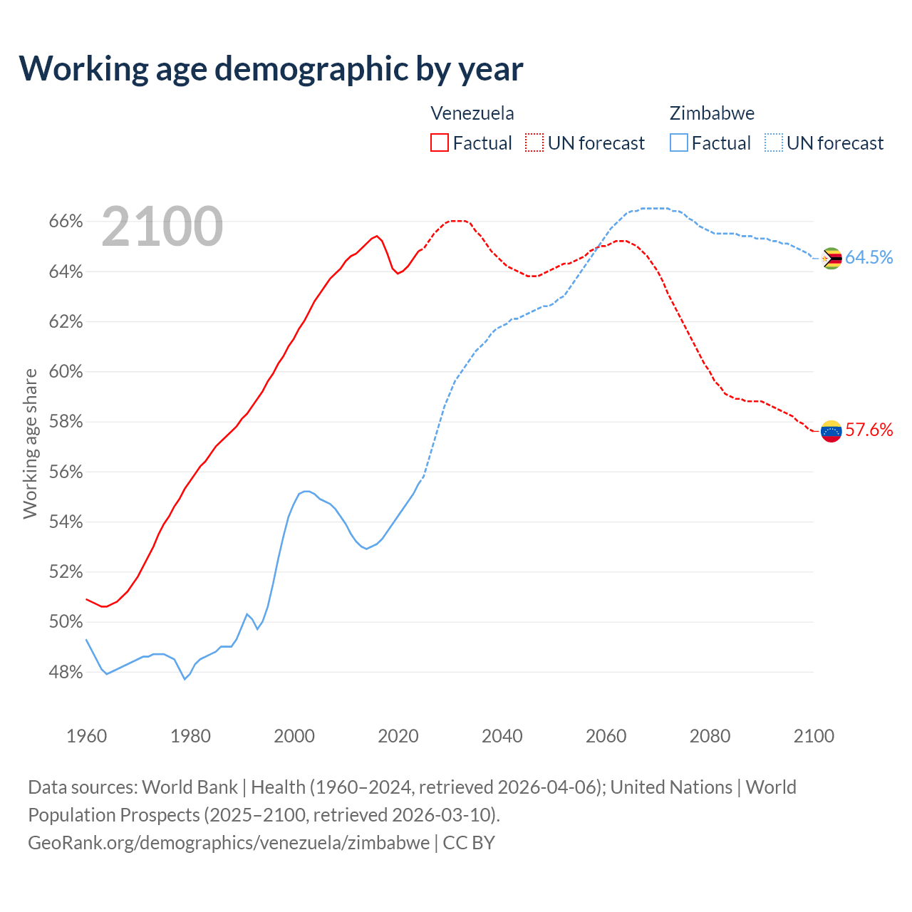 Median age Venezuela vs Zimbabwe, 1960-2100