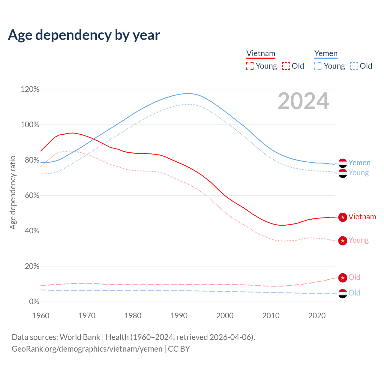 Data sources: World Bank | Health (1960–2024, retrieved 2026-04-06); U.S. Census Bureau (1960–2024, retrieved 2026-02-08).