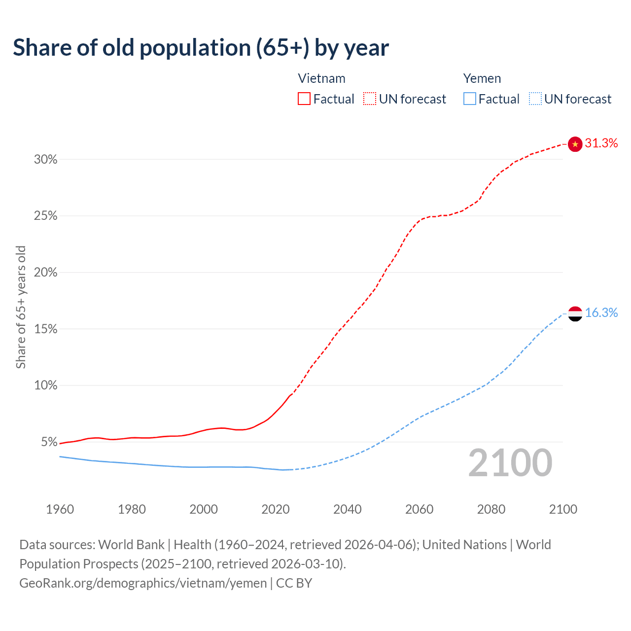 The share of older people aged 65 and over is 9.05% in Vietnam and 2.52% in Yemen. Life expectancy in Vietnam compared to Yemen .