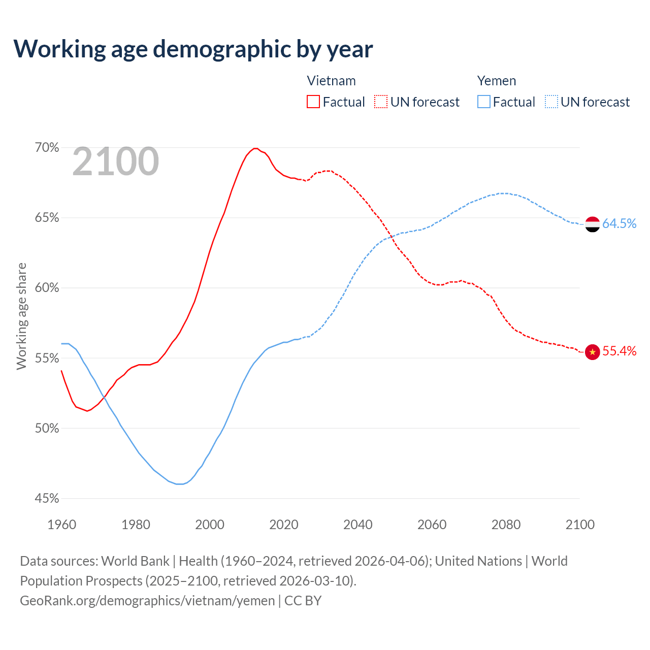 Median age Vietnam vs Yemen, 1960-2100