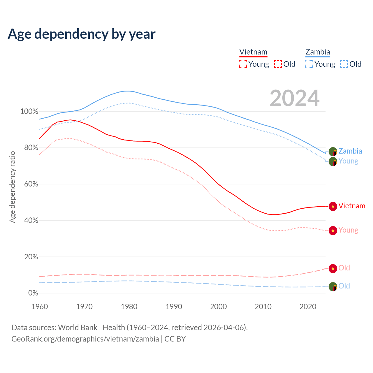 - Vietnam is ranked 84/196 by median age (oldest to youngest) vs 182/196 for Zambia.