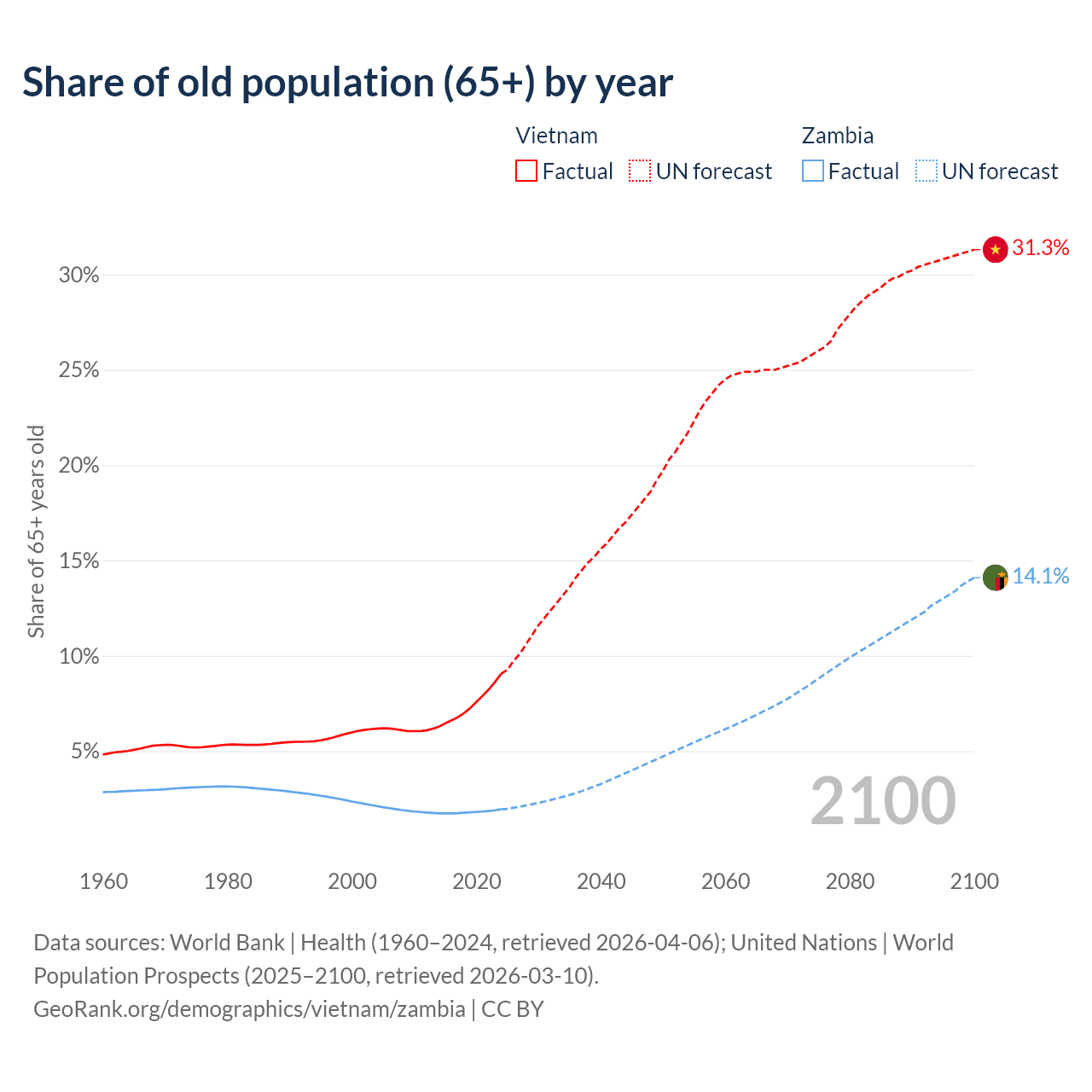 The share of older people aged 65 and over is 9.05% in Vietnam and 1.95% in Zambia. Life expectancy in Vietnam compared to Zambia .