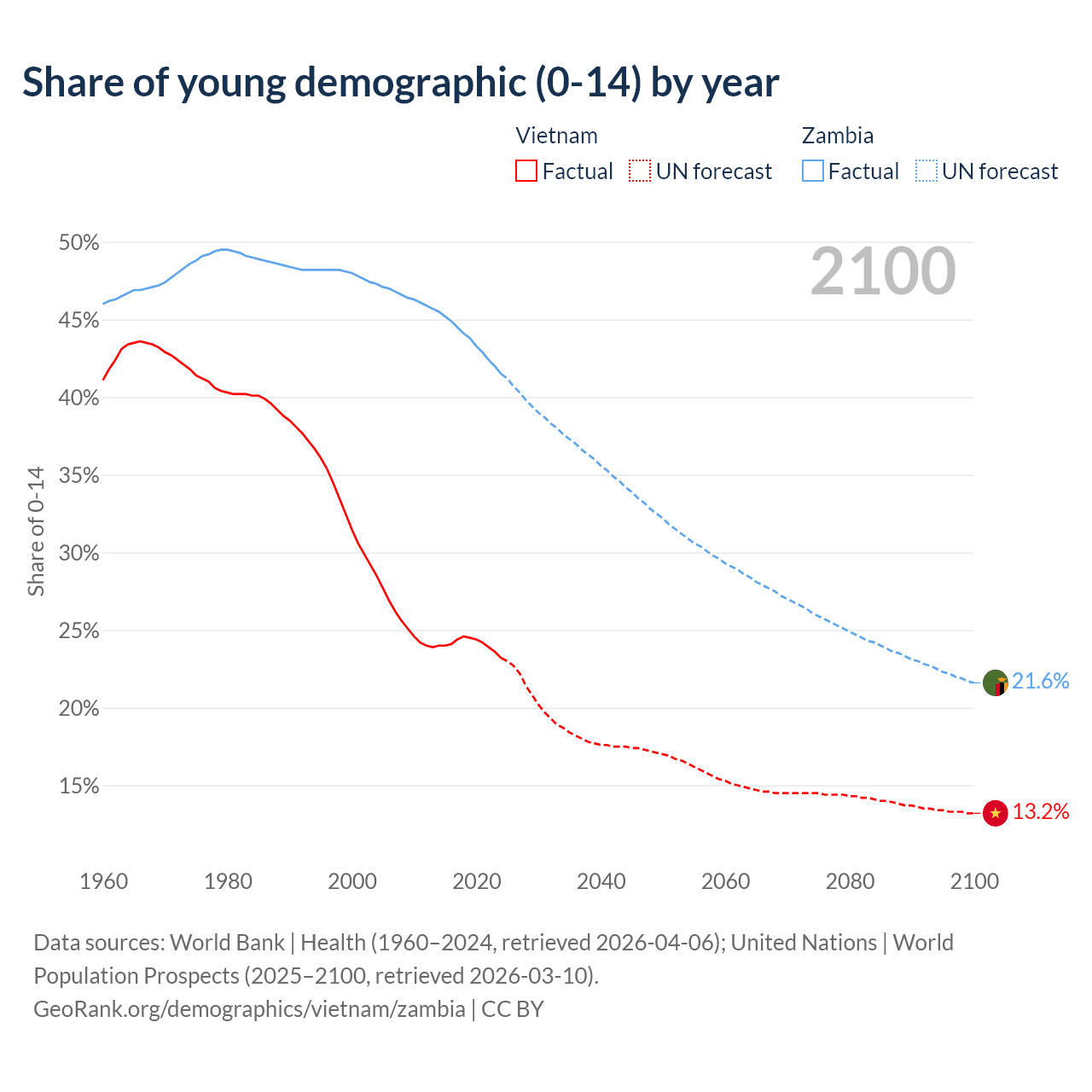 - As of 2026, the population of Vietnam is 102M vs 22.7M in Zambia - 4.51 times difference.