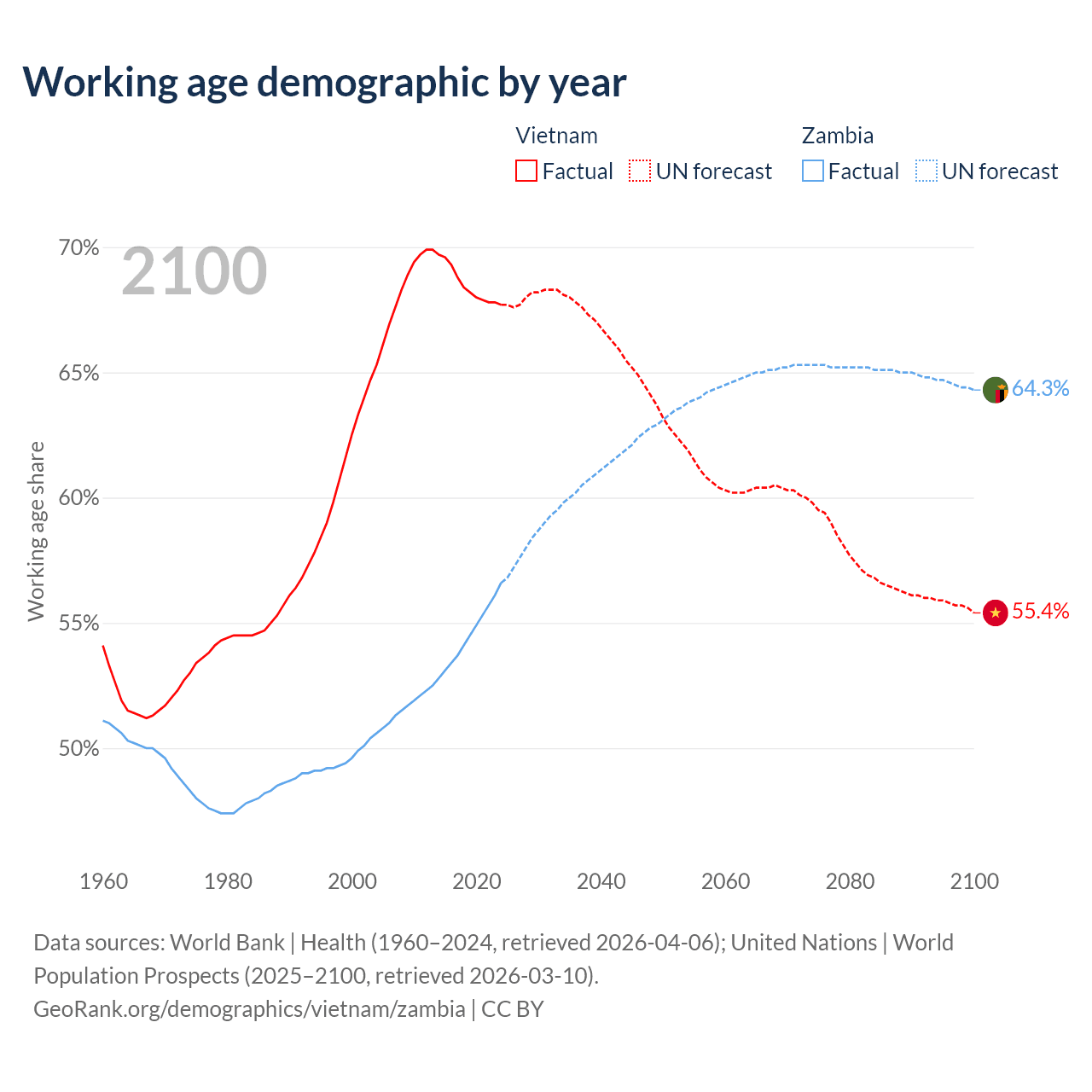 - Vietnam has 69.3M working age adults (aged 15-64) vs 12.8M in Zambia.