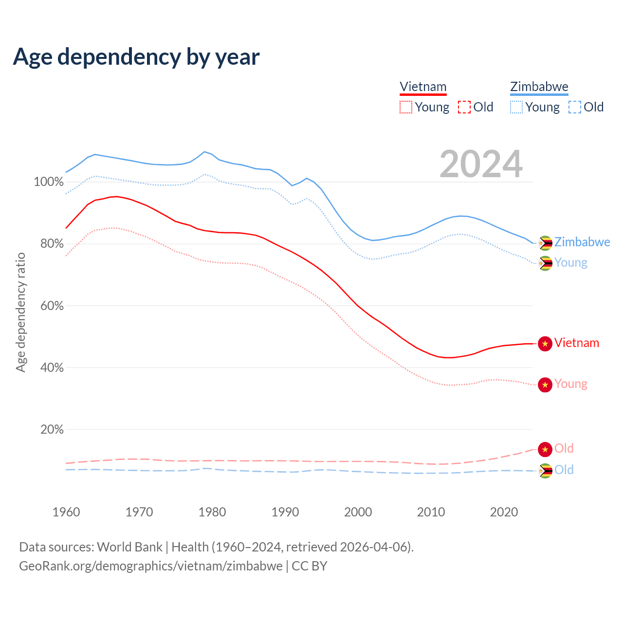 Data sources: World Bank | Health (1960–2024, retrieved 2026-04-06); U.S. Census Bureau (1960–2024, retrieved 2026-02-08).