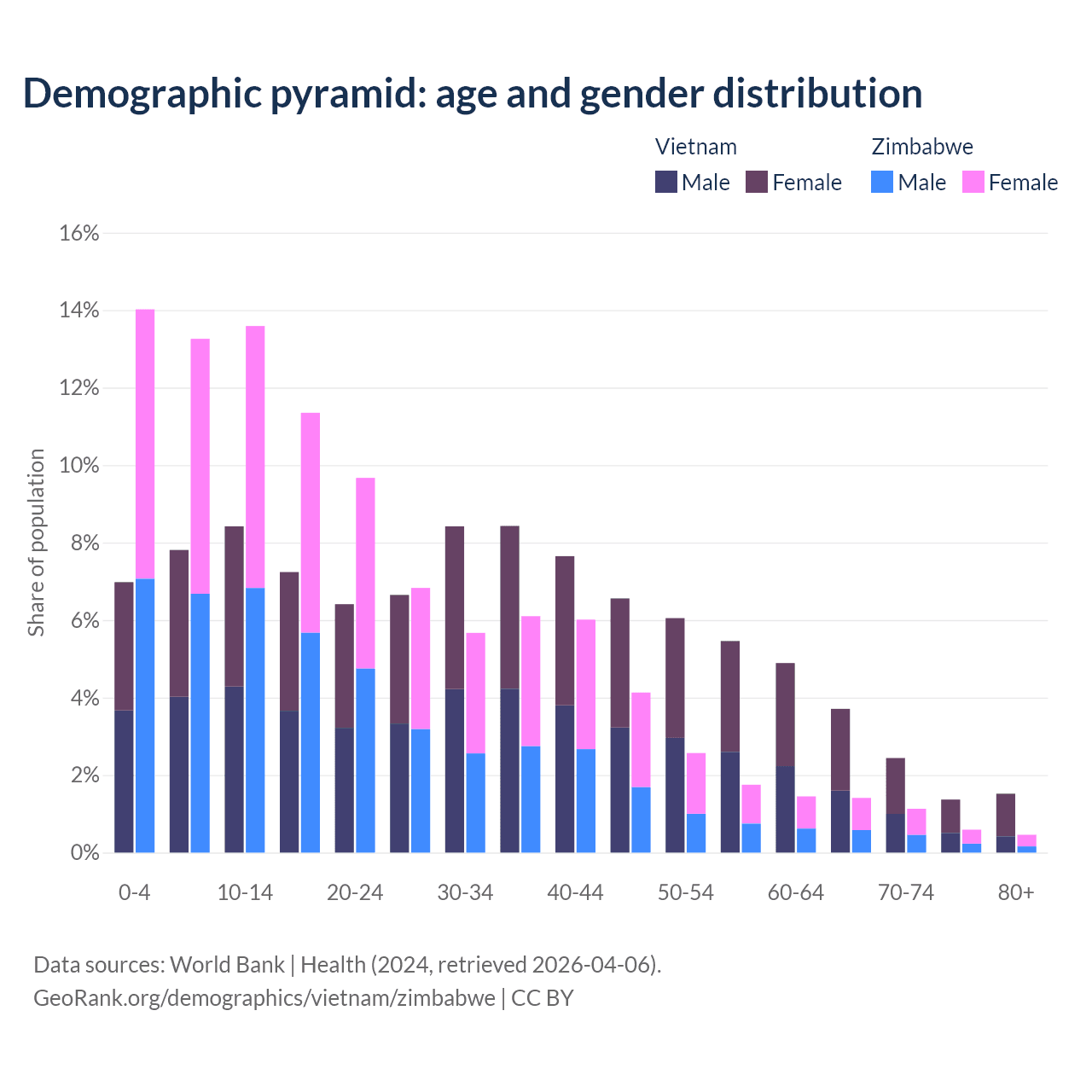 The share of older people aged 65 and over is 9.05% in Vietnam and 3.6% in Zimbabwe. Life expectancy in Vietnam compared to Zimbabwe .