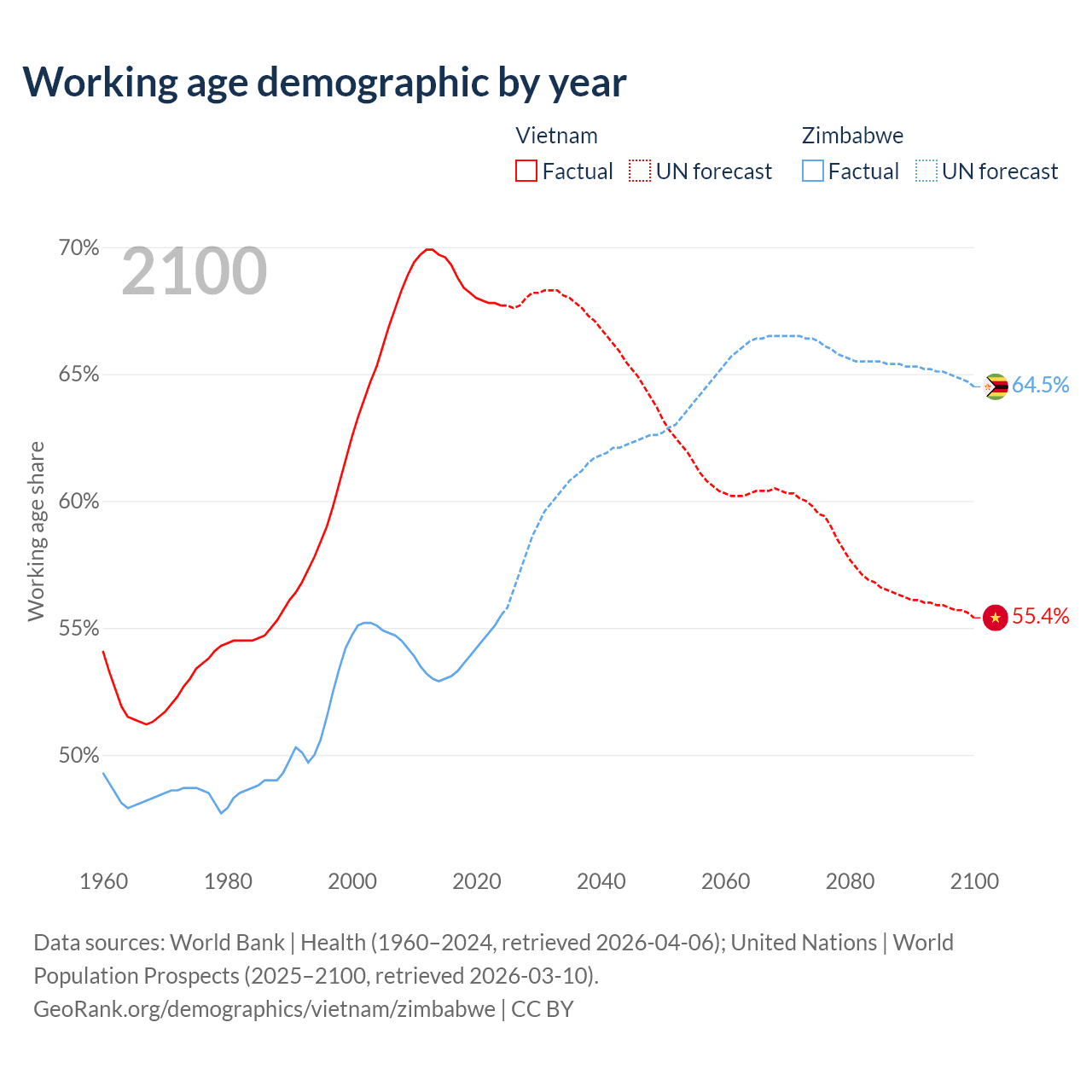Median age Vietnam vs Zimbabwe, 1960-2100