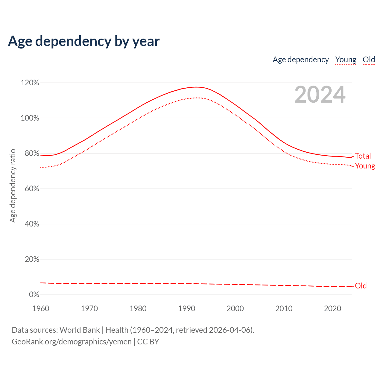 Data sources: World Bank | Health (1960–2024, retrieved 2026-04-06); U.S. Census Bureau (1960–2024, retrieved 2026-02-08).