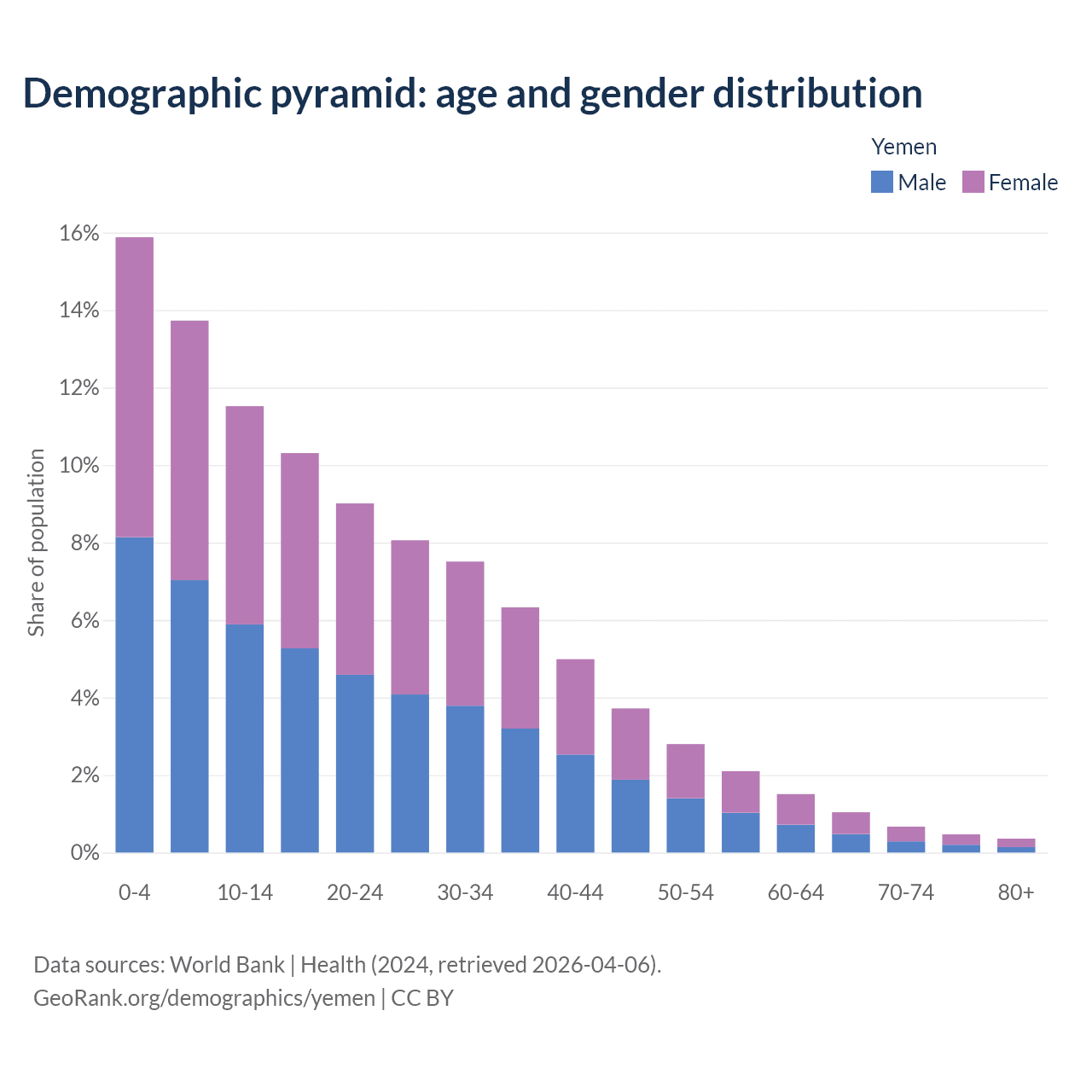 With a population of 40.6M people, Yemen has a median age of 19.3 years which makes it the 174/196 oldest country. 41.1% of the demographic are children 0-14 years old, 56.3% are working-age people aged 15-64, and 2.52% are older population aged 65+ years.