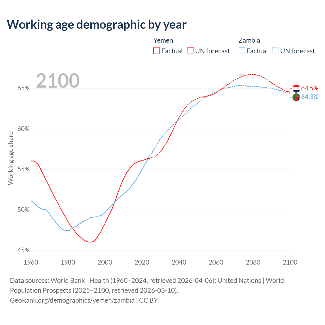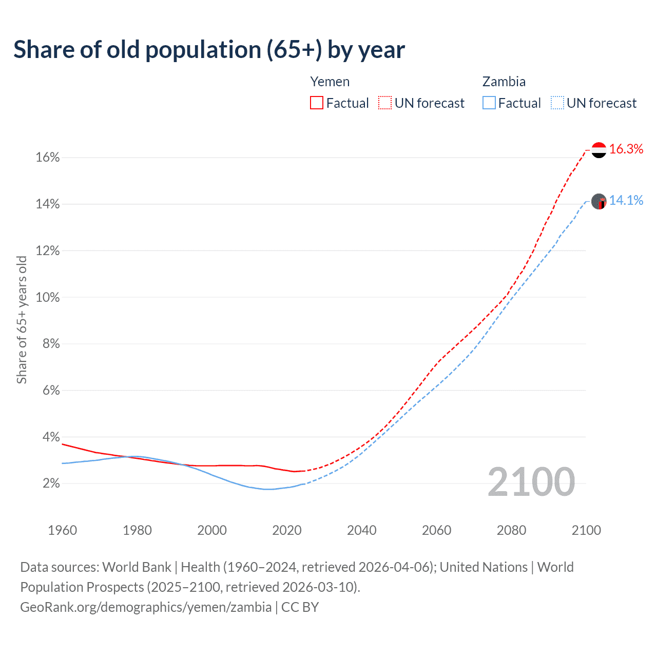 The share of older people aged 65 and over is 2.52% in Yemen and 1.95% in Zambia. Life expectancy in Yemen compared to Zambia .