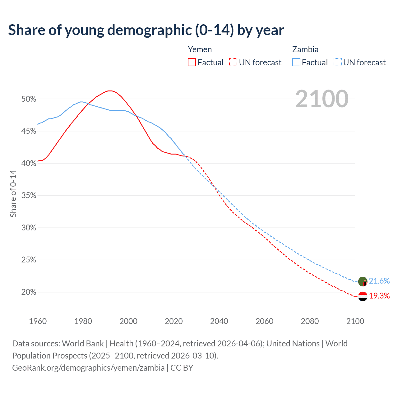- The share of young demographic (0-15 years old) in Yemen is 41.1% vs 41.5% in Zambia.