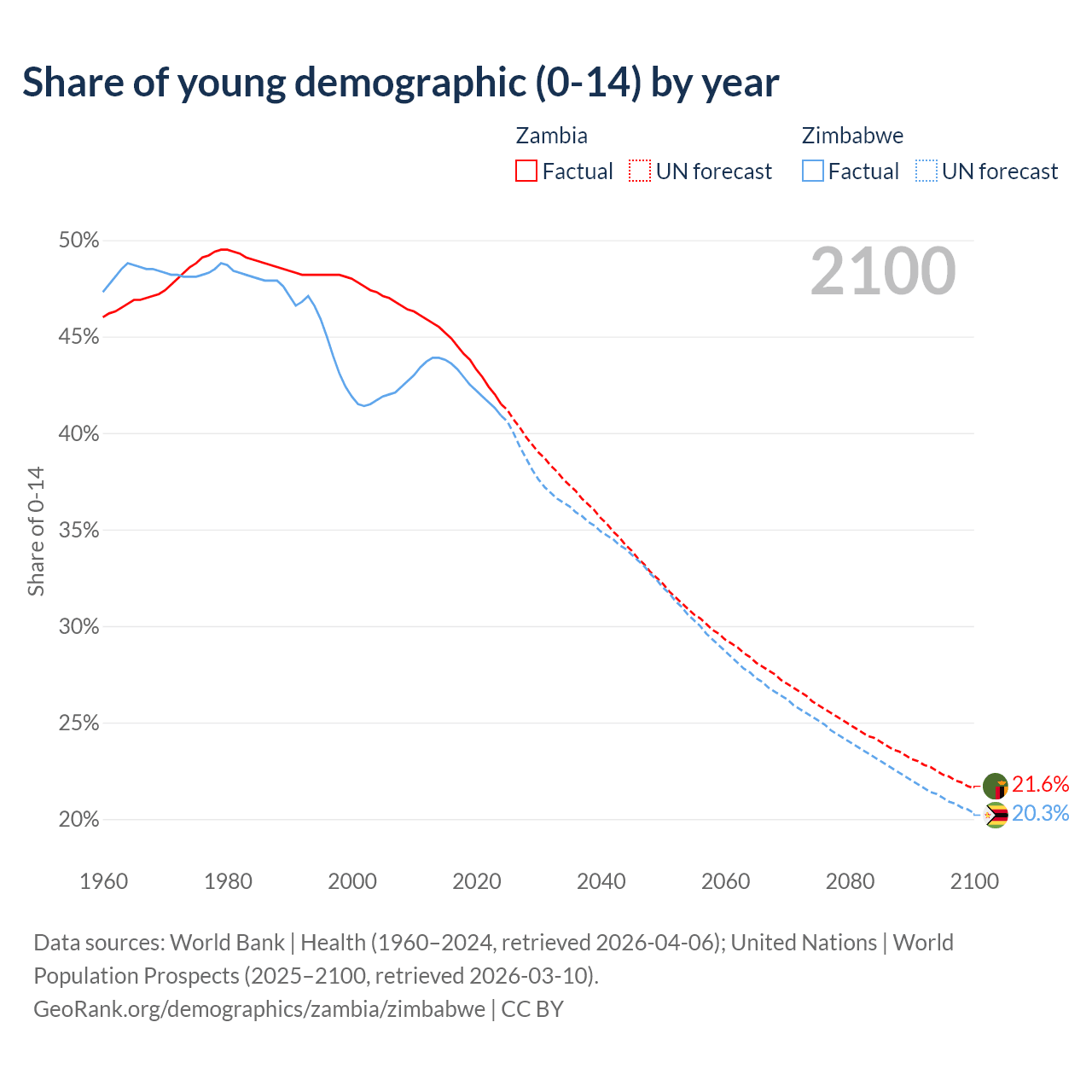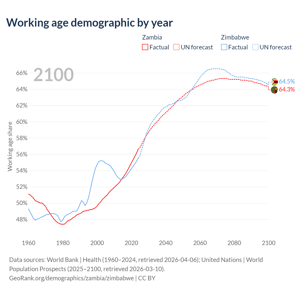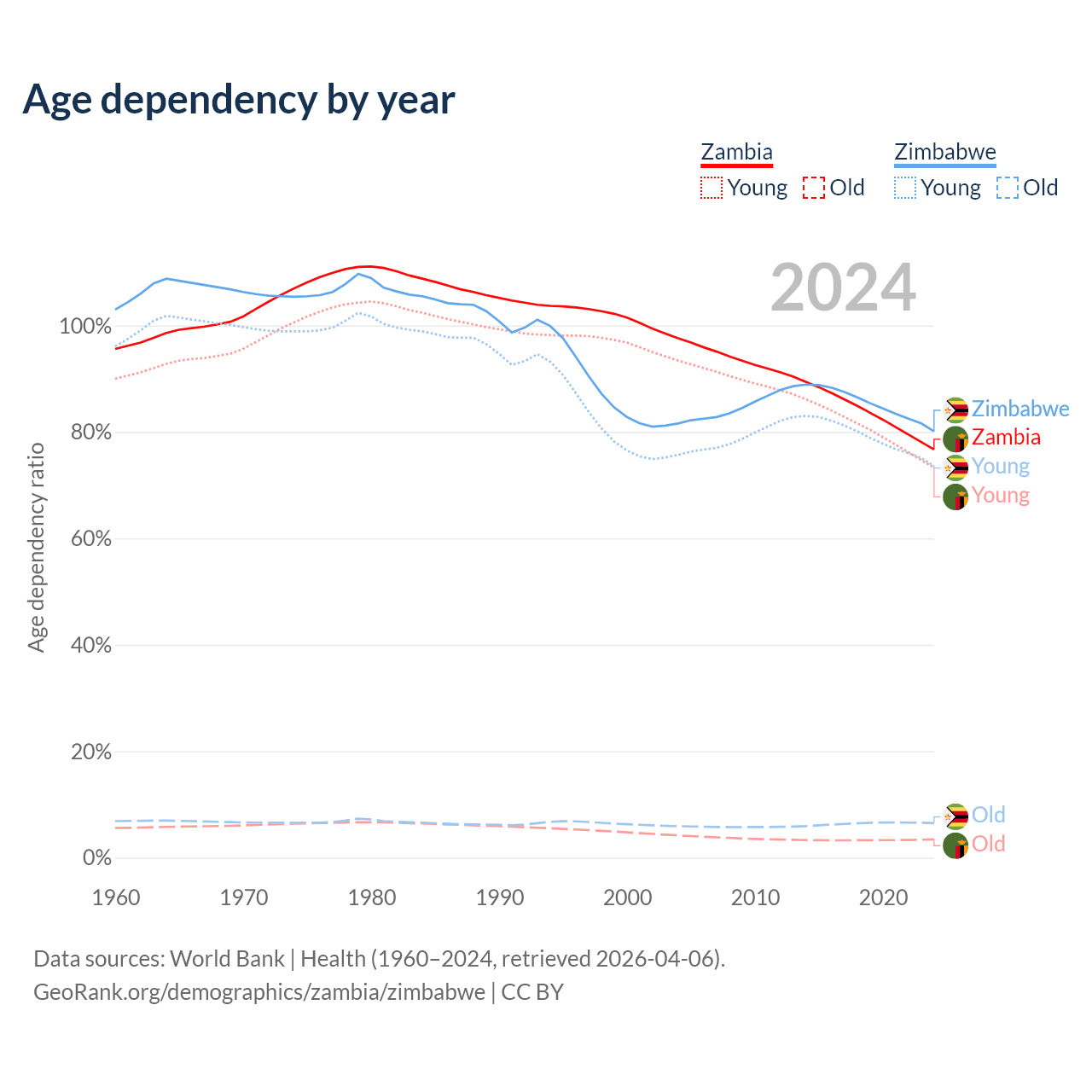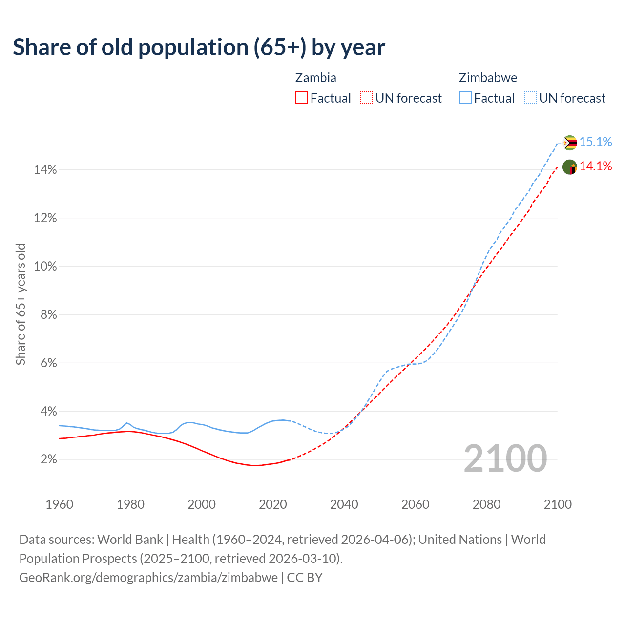 The share of older people aged 65 and over is 1.95% in Zambia and 3.6% in Zimbabwe. Life expectancy in Zambia compared to Zimbabwe .