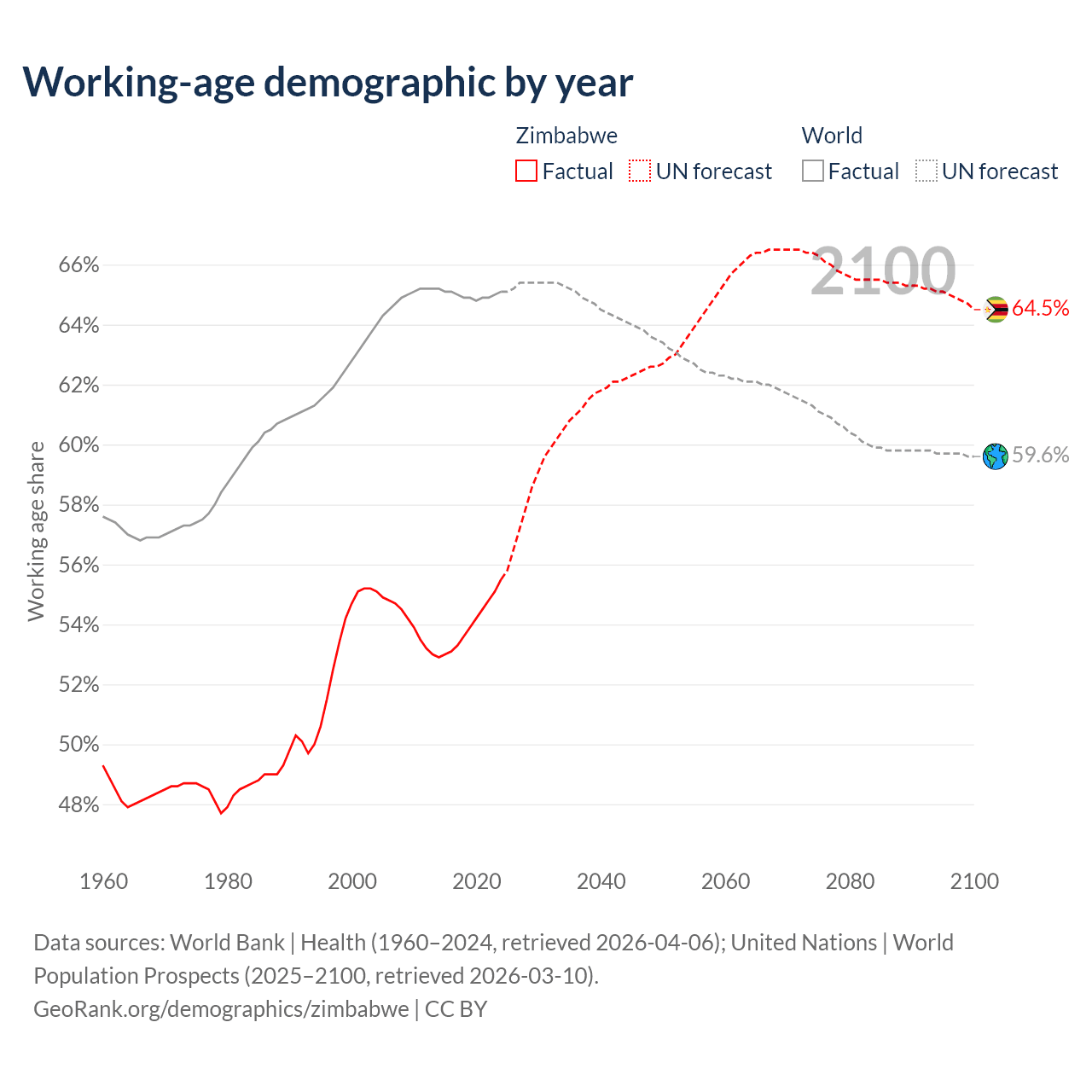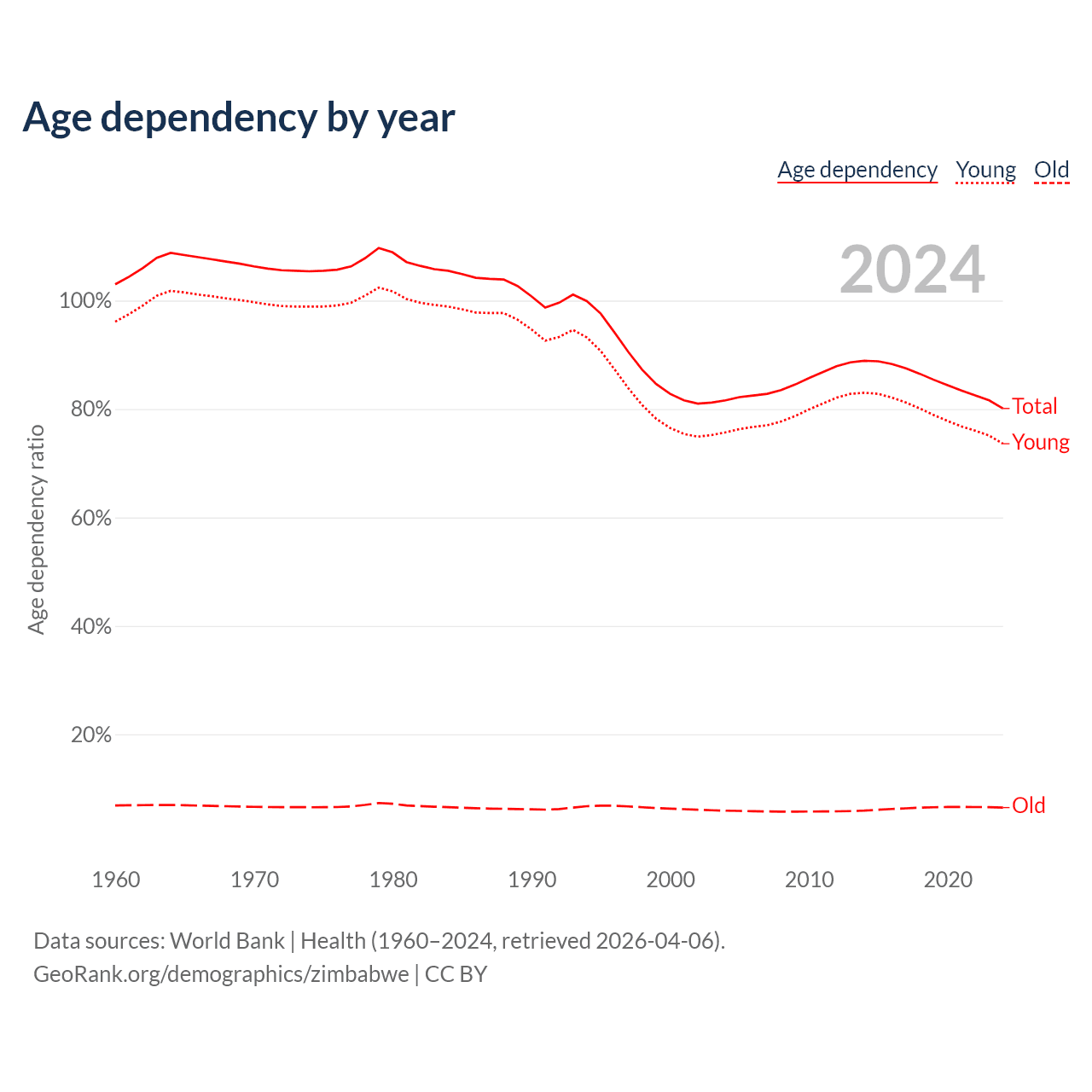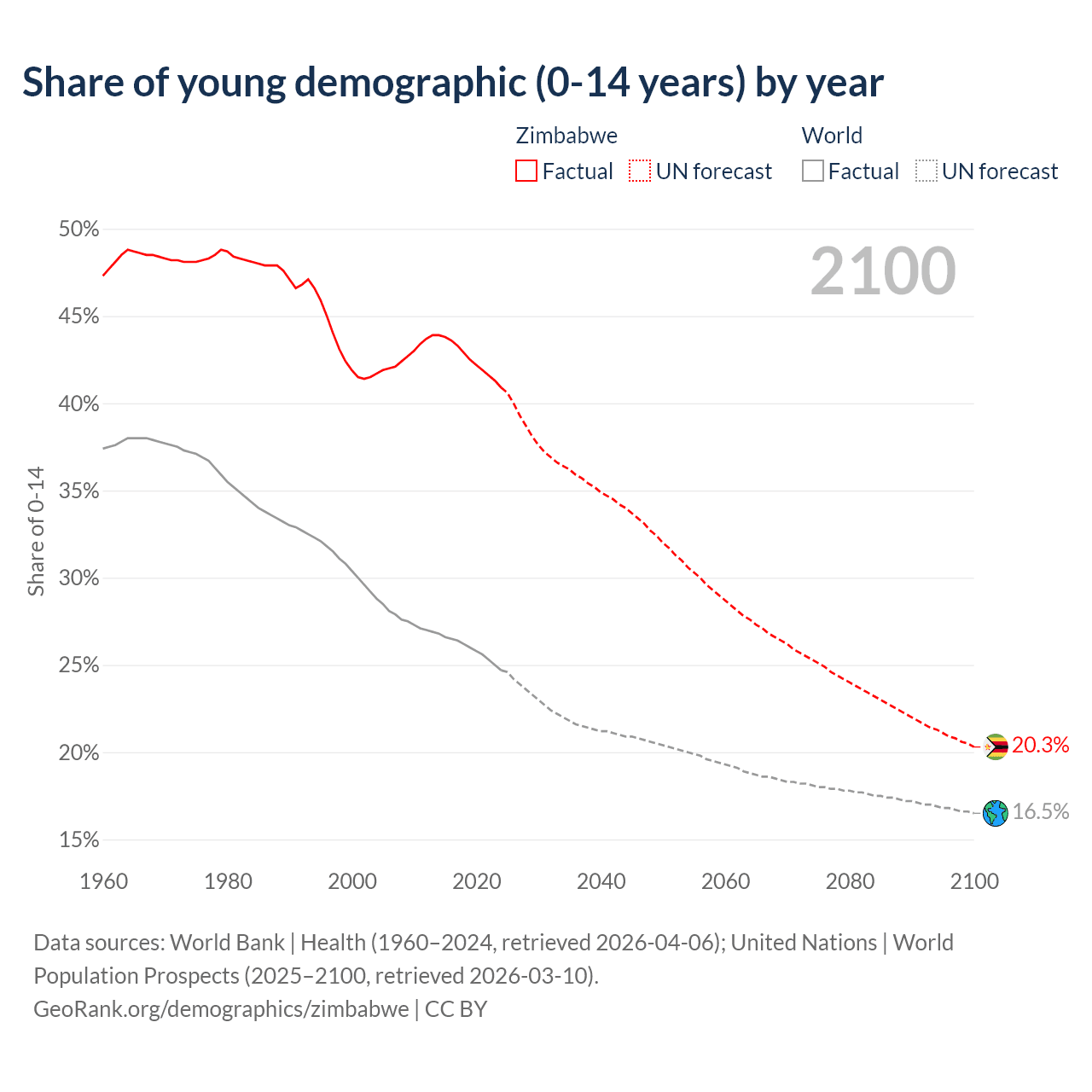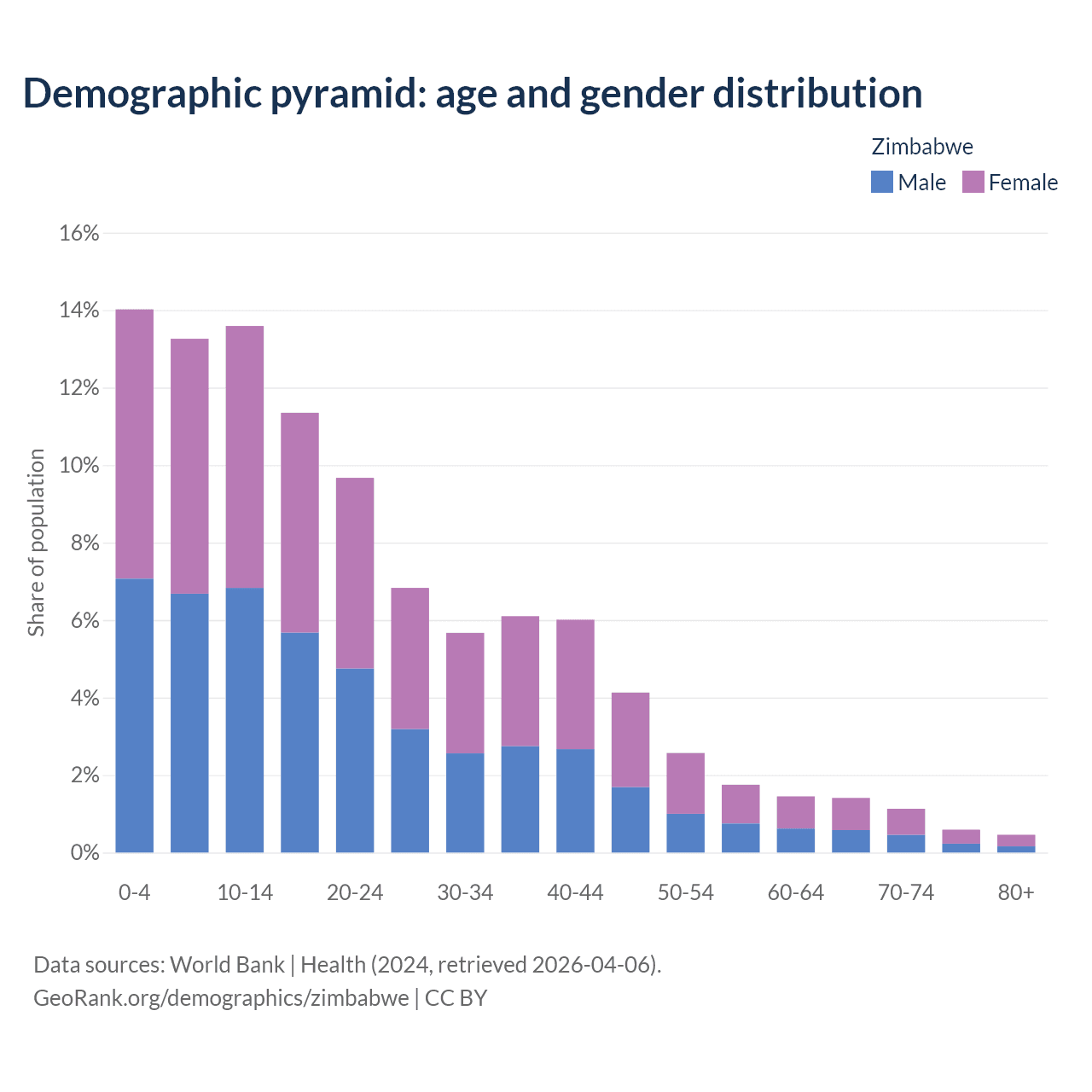 With a population of 16.6M people, Zimbabwe has a median age of 19 years which makes it the 177/196 oldest country. 40.9% of the demographic are children 0-14 years old, 55.5% are working-age people aged 15-64, and 3.6% are older population aged 65+ years.