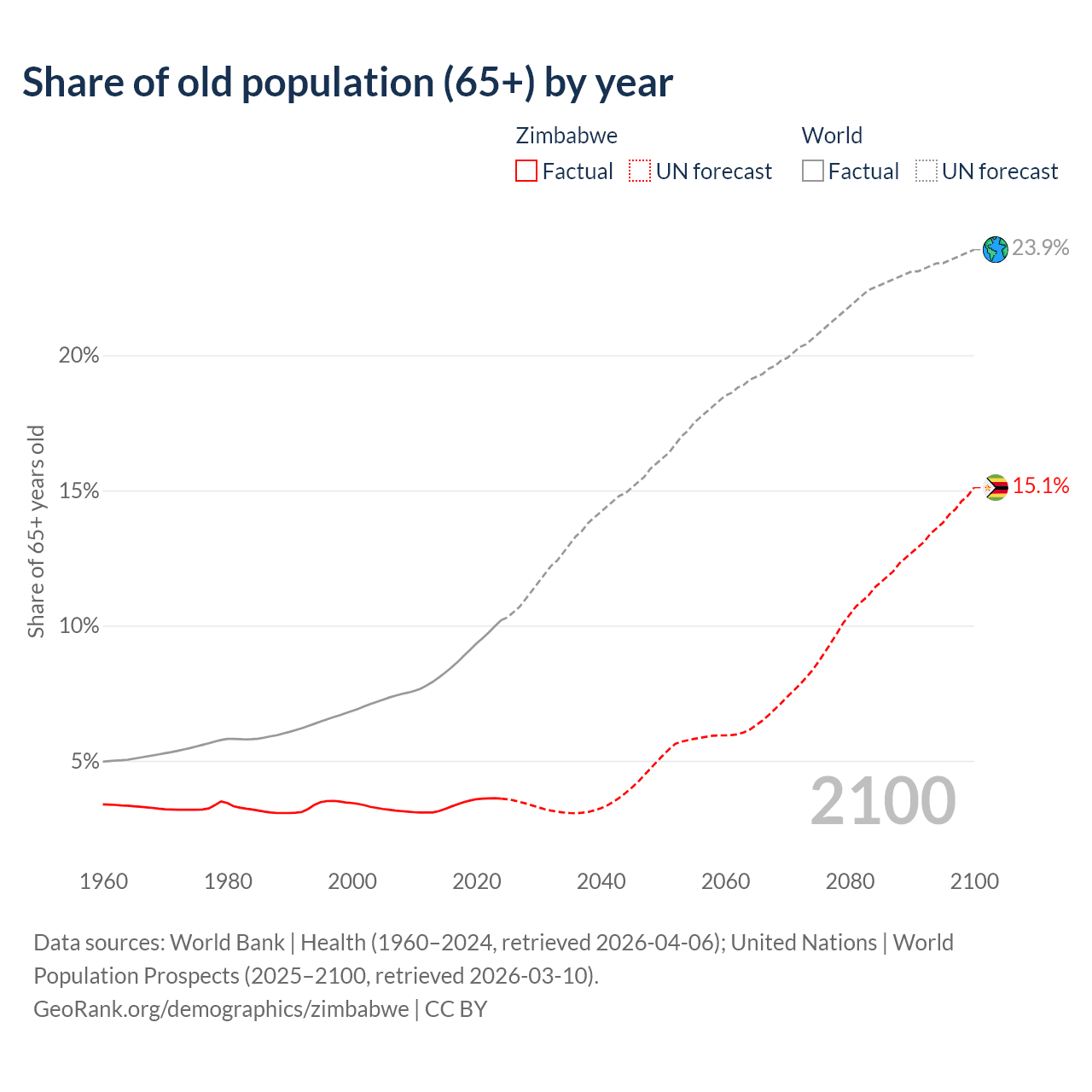 The share of older people aged 65 and over in Zimbabwe increased from 3.26% to 3.6% between 2004 and 2024.