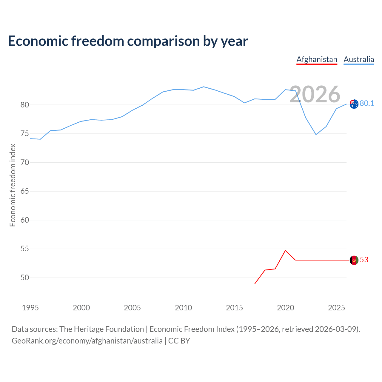 The Economic Freedom Index for Afghanistan is 53, ranking 142/197, compared to 80.1 for Australia, ranking 5/197. The chart above displays a comparison of annual changes in economic freedom indexes.