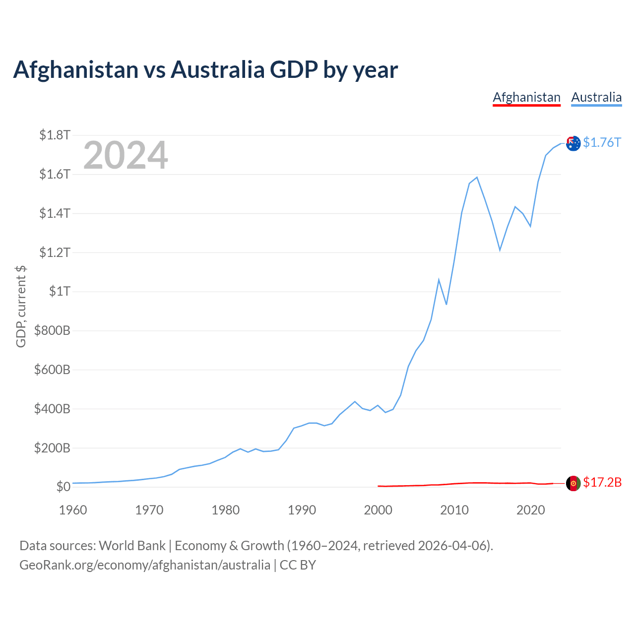 Afghanistan has a GDP of $17.2B compared to $1.76T for Australia, ranking 137/197 and 14/197 by economy size, respectively.