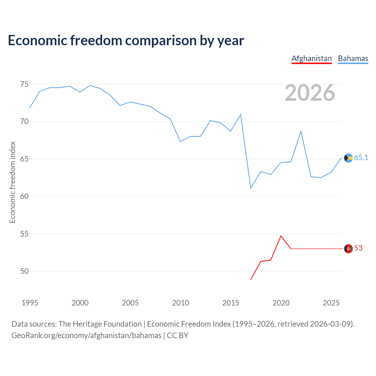 The Economic Freedom Index for Afghanistan is 53, ranking 142/197, compared to 65.1 for the Bahamas, ranking 66/197. The chart above displays a comparison of annual changes in economic freedom indexes.