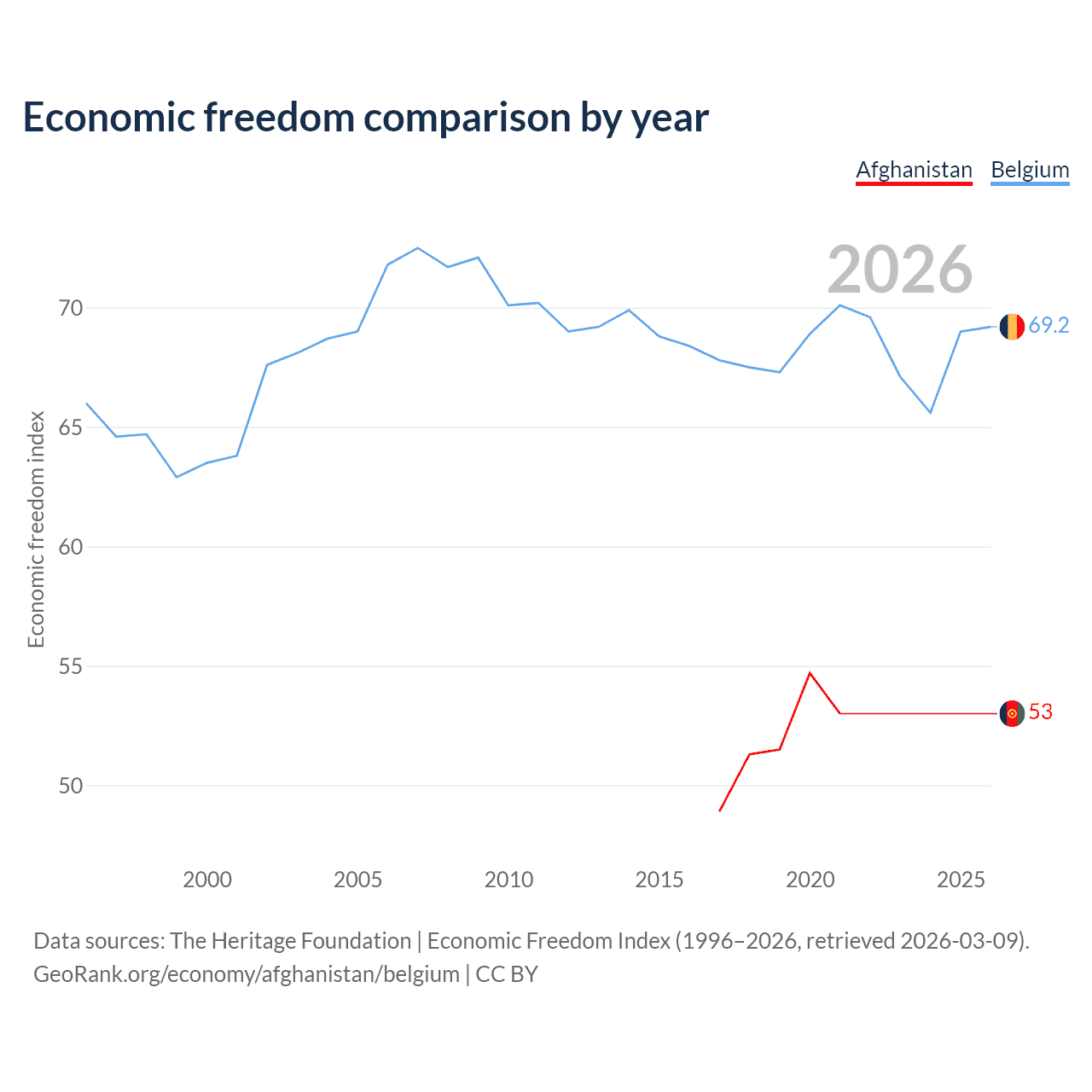 The Economic Freedom Index for Afghanistan is 53, ranking 142/197, compared to 69.2 for Belgium, ranking 42/197. The chart above displays a comparison of annual changes in economic freedom indexes.