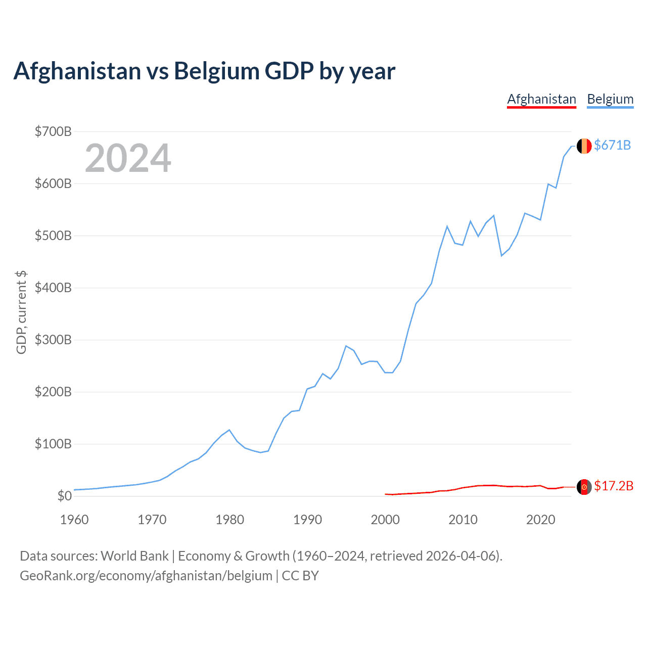 Afghanistan has a GDP of $17.2B compared to $671B for Belgium, ranking 137/197 and 23/197 by economy size, respectively.