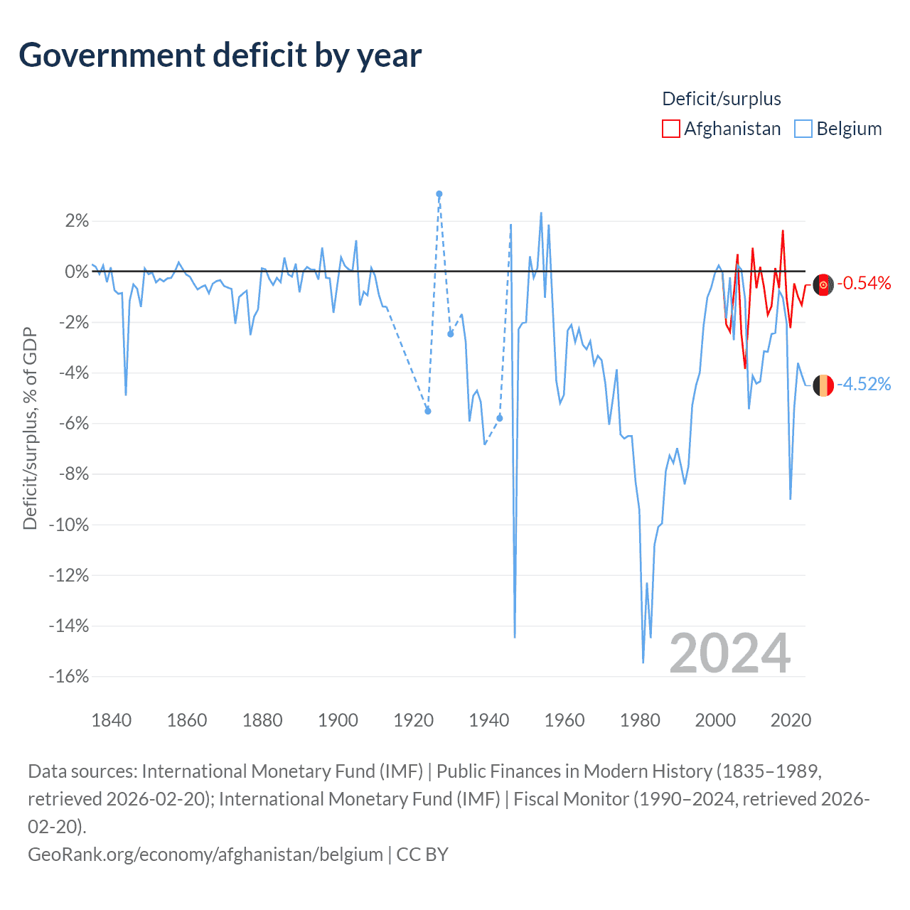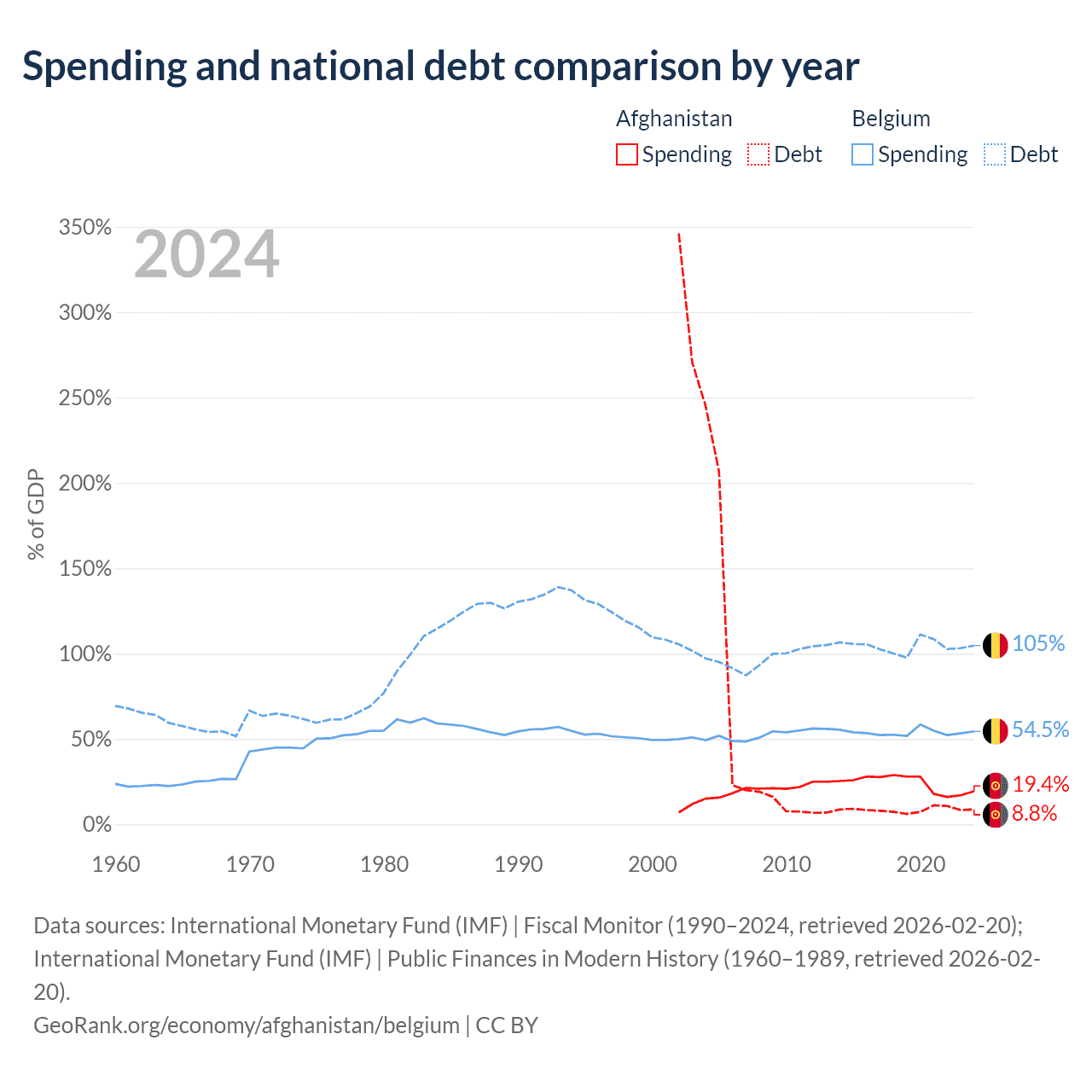 Afghanistan has $1.44B in government debt (8.8% of GDP), compared to $703B (104.7% of GDP) in Belgium.