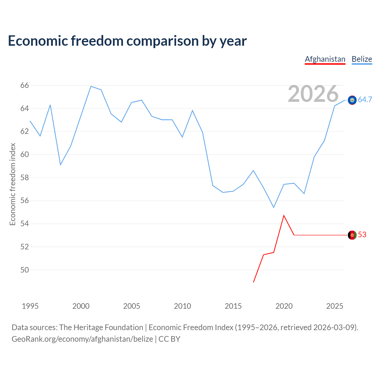 The Economic Freedom Index for Afghanistan is 53, ranking 142/197, compared to 64.7 for Belize, ranking 71/197. The chart above displays a comparison of annual changes in economic freedom indexes.