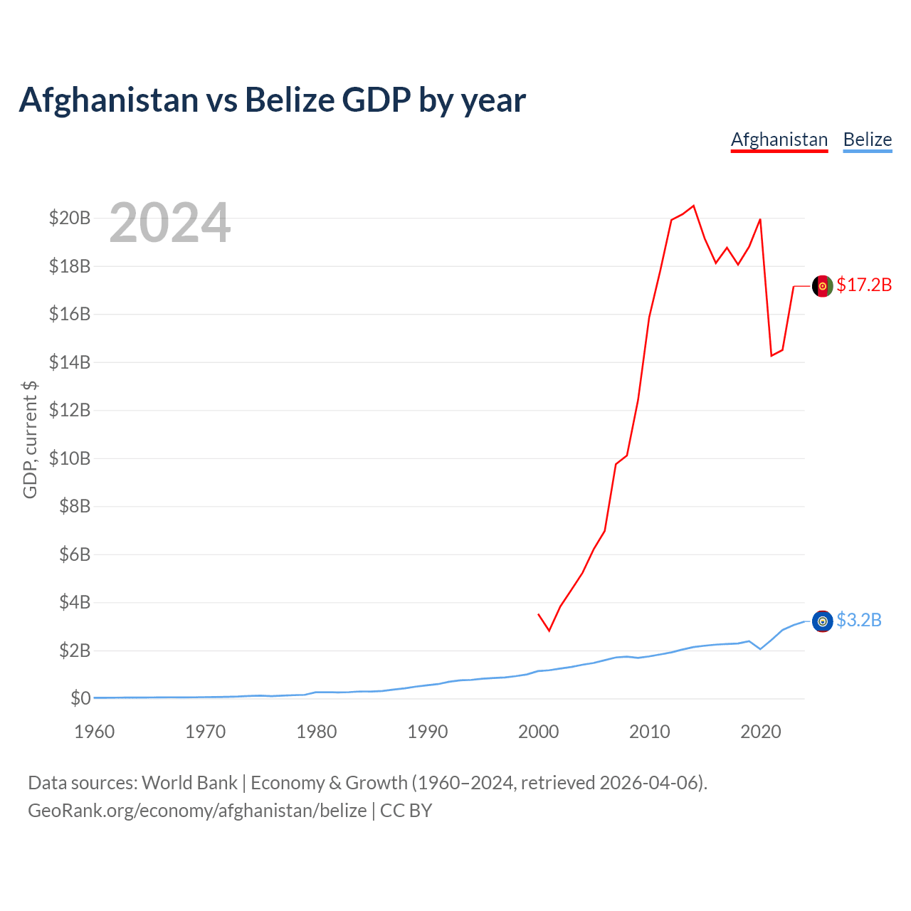 Afghanistan has a GDP of $17.2B compared to $3.2B for Belize, ranking 137/197 and 168/197 by economy size, respectively.
