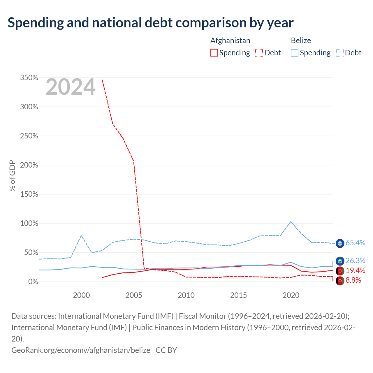 Afghanistan has $1.44B in government debt (8.8% of GDP), compared to $2.1B (65.4% of GDP) in Belize.