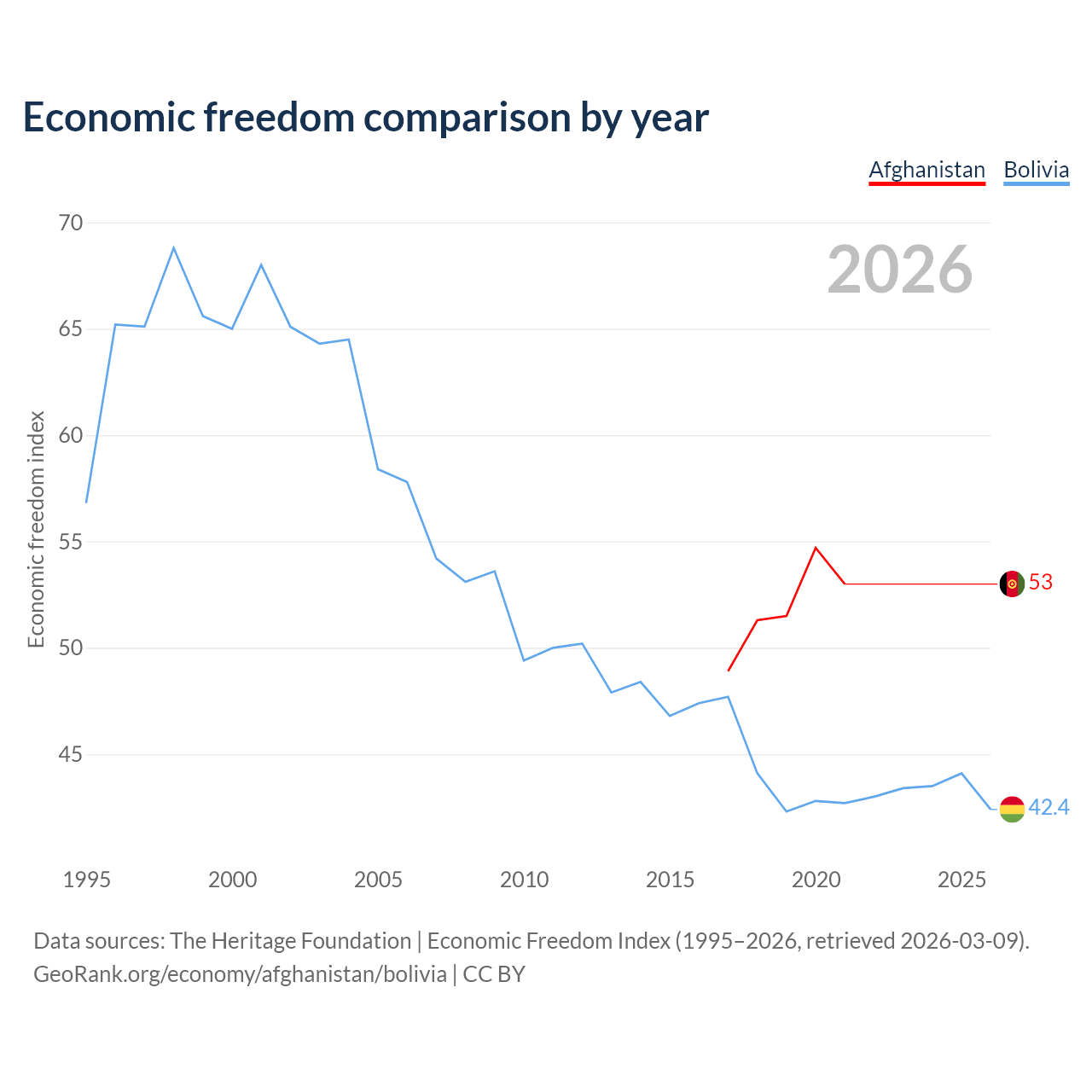 The Economic Freedom Index for Afghanistan is 53, ranking 142/197, compared to 42.4 for Bolivia, ranking 184/197. The chart above displays a comparison of annual changes in economic freedom indexes.